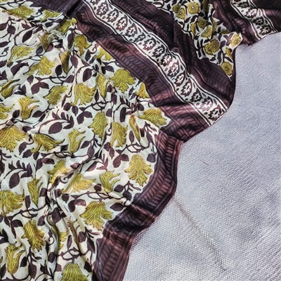 Step into a world of elegance with our Cream Floral Symphony Modal Silk Saree with a Brownish-Purple Border. This stunning saree features a harmonious blend of cream base adorned with intricate floral patterns in yellow and brown, complemented by a rich brownish-purple border for a touch of sophistication.