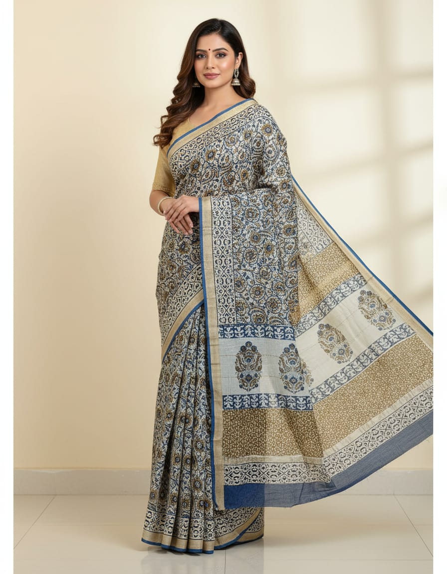 Step into a world where time-honored craftsmanship meets contemporary elegance with this enchanting cream and navy saree. Every inch of this piece is a celebration of the authentic Bagru hand block print, a technique that has been cherished for generations. The intricate floral and geometric motifs tell a story that resonates with the heart of Indian heritage.