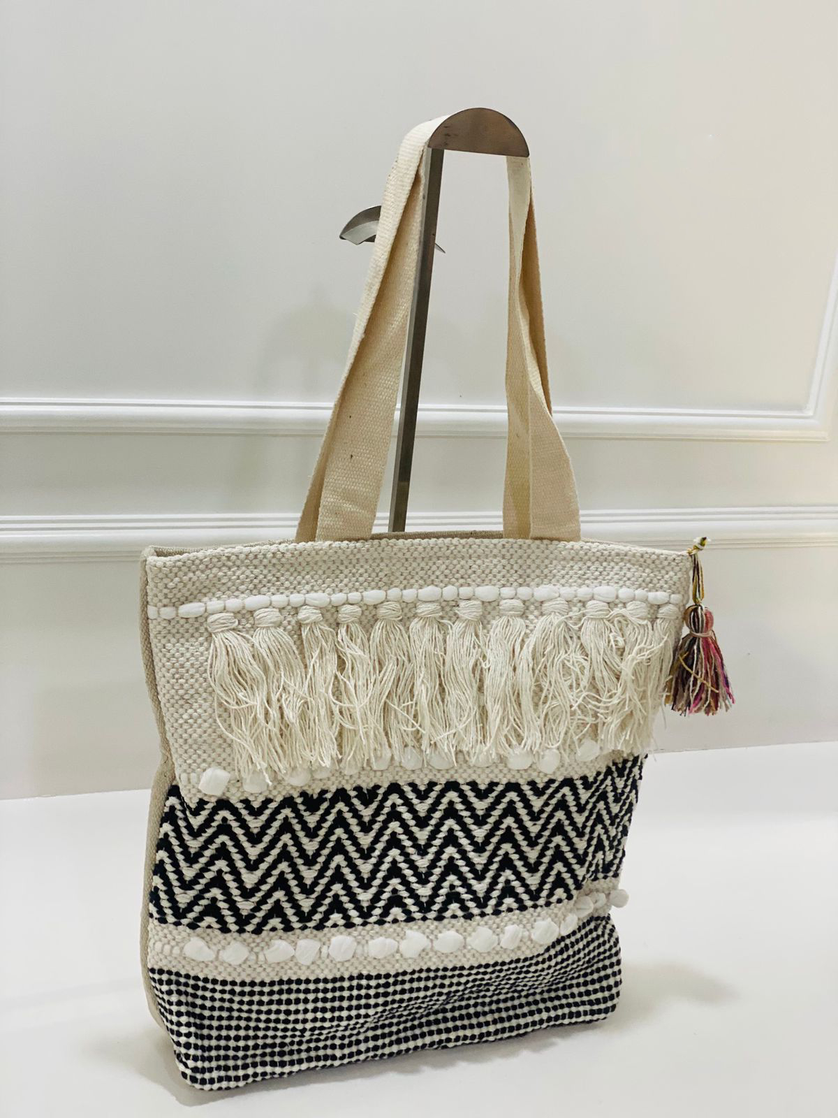 Rooted in rich Indian textile heritage, this Cream Zigzag Woven Trendy Jhola Bag seamlessly intertwines traditional craftsmanship with modern sensibilities. The shimmering cream canvas beautifully contrasts with a striking black zigzag pattern and playful check motif, creating a visual harmony that’s both eye-catching and unique.