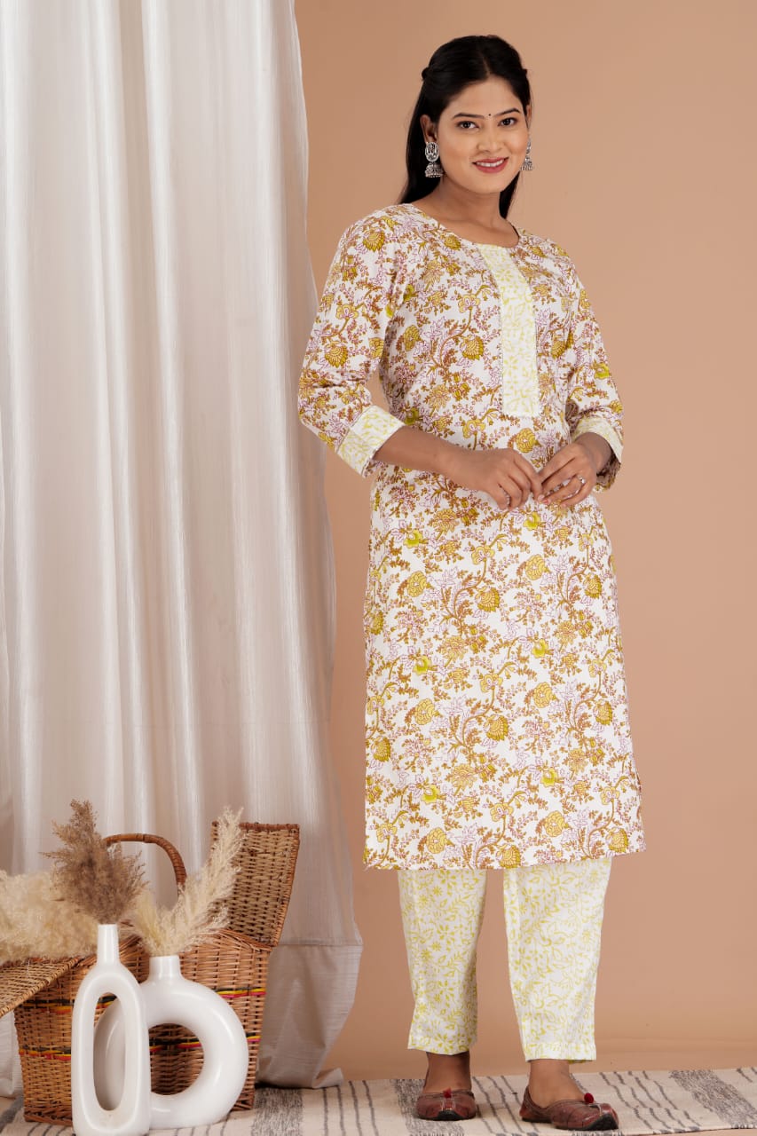 Step into a world of artisanal beauty with our Creamy Floral Grace Cotton A-Line Set. This exquisite ensemble is lovingly crafted from soft, breathable cotton, showcasing a delicate floral pattern that dances across a creamy white backdrop. Each bloom features shades of mustard yellow, terracotta, and hints of lavender, bringing warmth and vibrancy to your attire.
