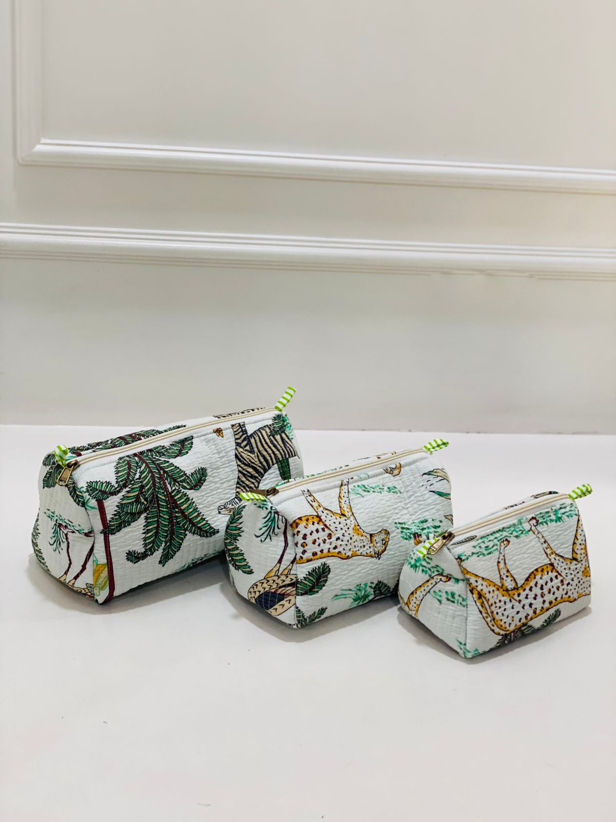 With its playful depiction of leopards and palm leaves dancing across a soft cream canvas, this set captures an enchanting spirit that resonates with lovers of nature. The selection of colors, from deep forest greens to sunny yellows, creates a vivid visual feast, making every pouch a statement piece.