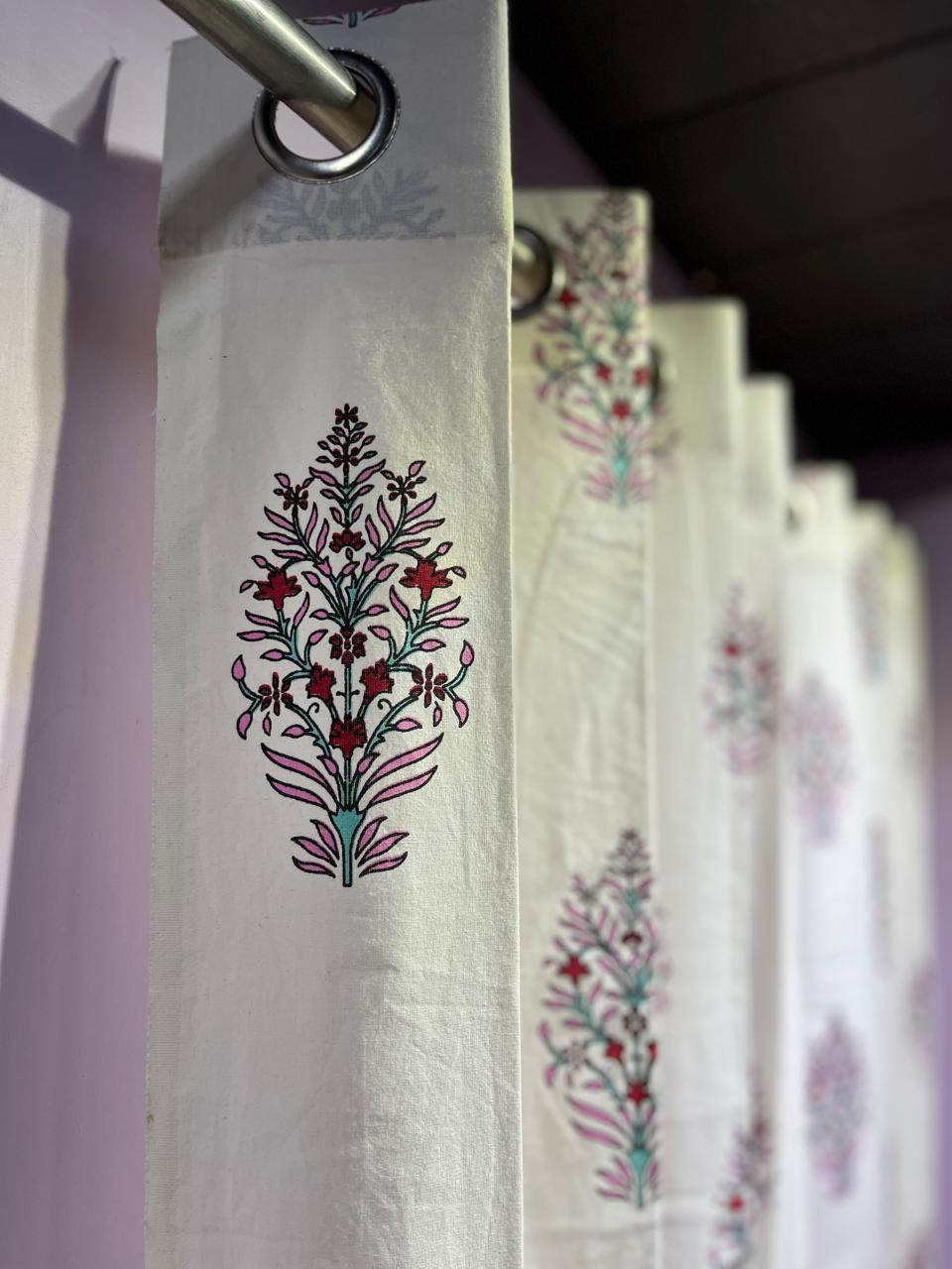 Delve into a world of elegance with our Crimson Bloom Block Print Cotton Curtains. This exquisite piece showcases a stunning array of deep crimson flowers intertwined with delicate mint green leaves, creating a visual symphony that brightens any room. Each motif is a tribute to the age-old traditions of Indian craftsmanship, intricately designed to resonate with both modern aesthetics and age-old artistry.
