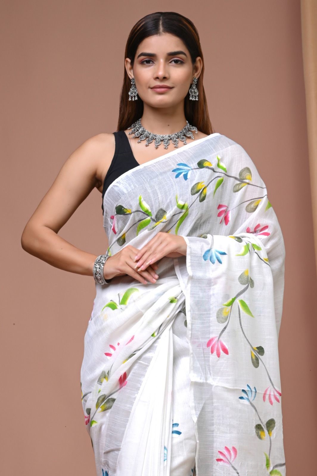 Discover the rich tapestry of Indian craftsmanship with our Crimson Bloom Hand Block Printed Linen Saree. This enchanting piece features a delightful array of vibrant floral motifs in shades of crimson and sky blue, set against a pristine white backdrop. The intricate designs echo traditional artistry, while the lightweight fabric ensures a graceful drape, making it a versatile addition to your wardrobe.