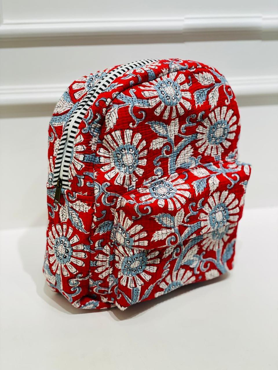 Step into a world where vibrant hues and intricate craftsmanship intertwine with the Crimson Bloom Handblocked Quilted Backpack. This artisan-crafted piece boasts a striking crimson backdrop adorned with white floral motifs and delicate light blue accents, reflecting the soul of traditional Indian artistry.