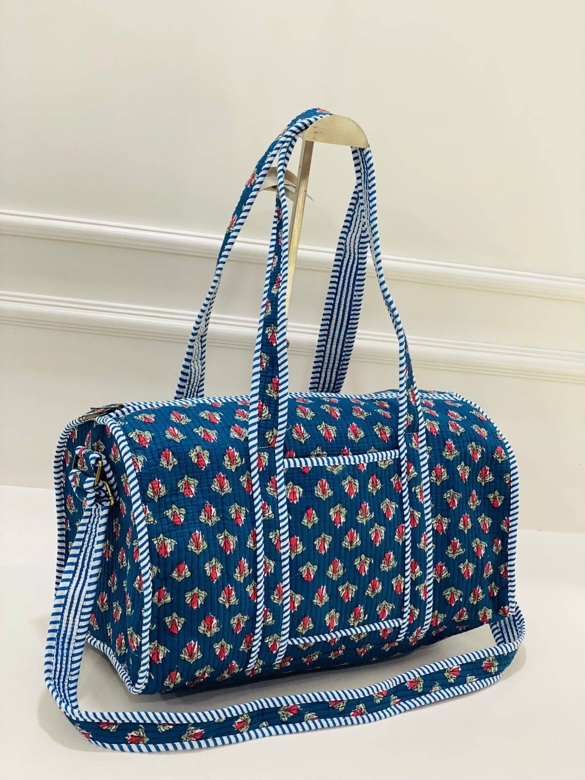 Embrace the richness of Indian textile traditions with the Crimson Bloom Quilted Cotton Duffle Bag. The deep blue backdrop adorned with small red flowers and green leaves creates a striking contrast, enhanced by the blue and white striped accents. The hand block prints showcase artisan techniques, ensuring each piece is unique. Practicality meets style with two carrying options - long handles and a detachable shoulder strap. Ideal for travel or daily use, this medium-sized bag is both functional and fashionable, adding a touch of Indian craftsmanship to your ensemble.