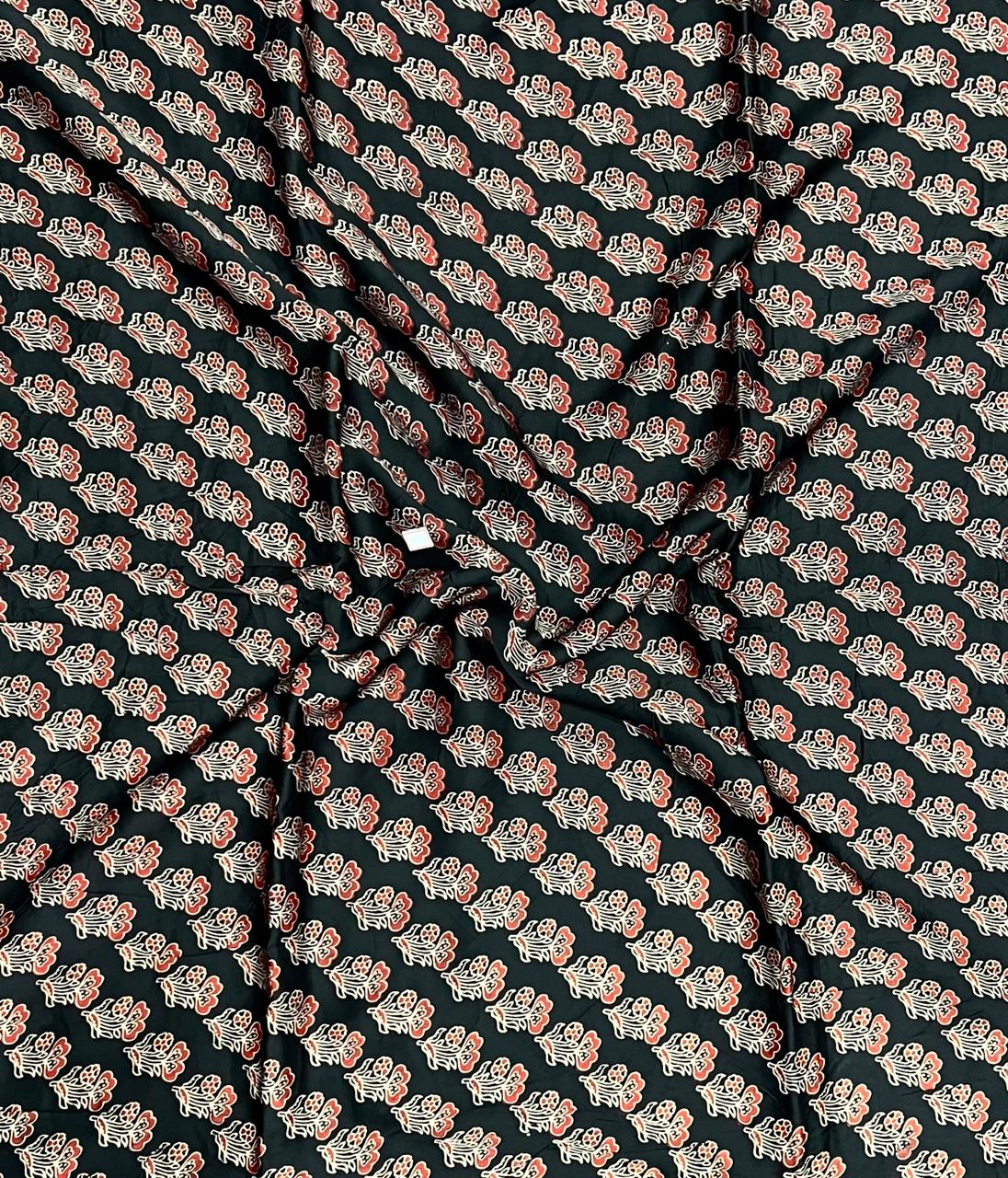 Enveloped in a deep black canvas, this exquisite fabric showcases vibrant crimson floral motifs, each intricately designed to create a captivating visual symphony. The stylized flowers dance across the fabric, evoking the essence of traditional Indian craftsmanship while seamlessly integrating contemporary aesthetics.