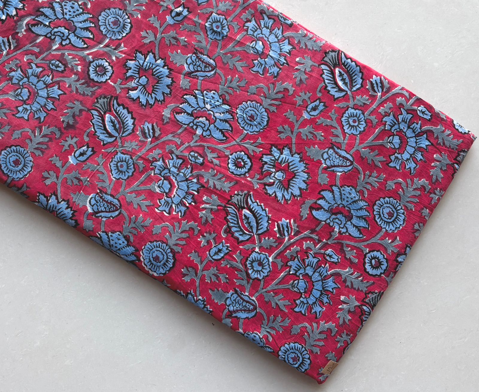 Discover the feeling of nature woven into fabric with our Crimson Blossom Hand Block Printed Cotton Fabric. This textile features a vibrant crimson backdrop, beautifully adorned with delicate floral motifs in soothing sky blue and charcoal gray. Each flower and leaf is carefully crafted, bringing a lush, organic aesthetic to your creations.