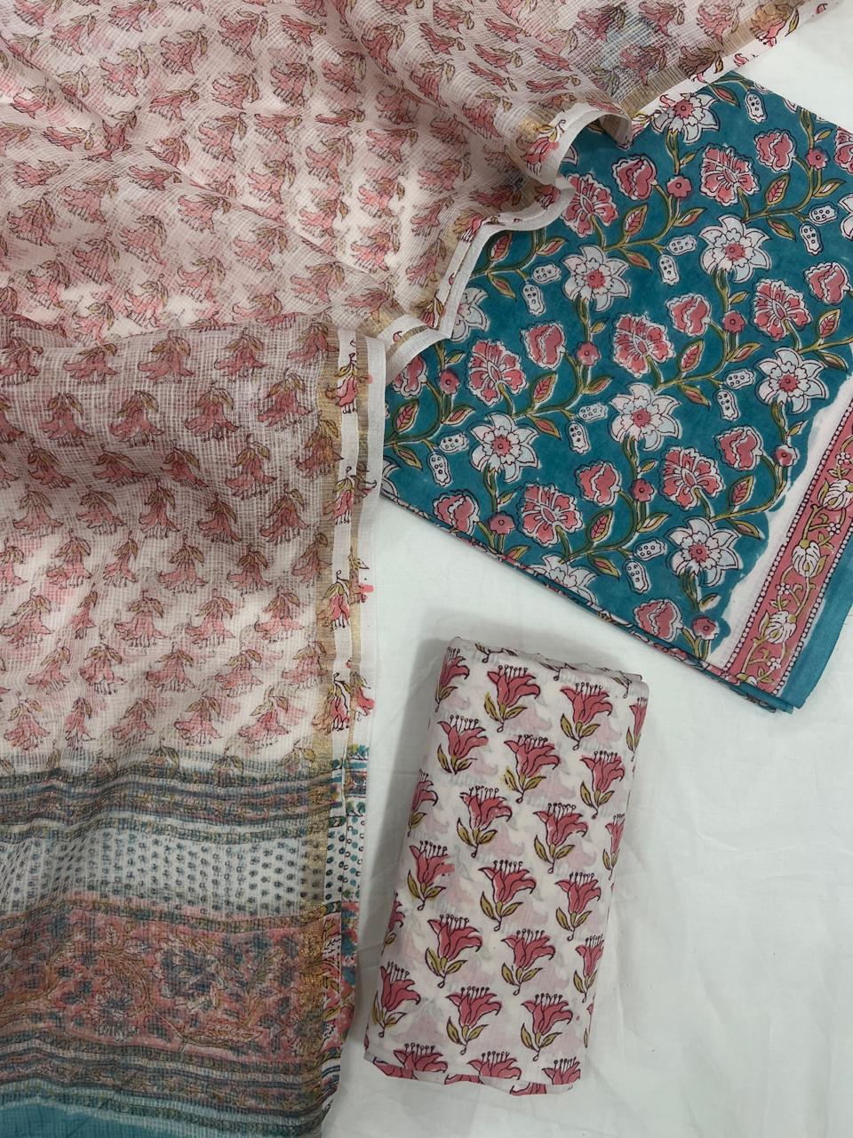 Imagine wrapping yourself in a canvas of blooming elegance, where the vibrant crimson florals dance against a soft blush backdrop, whispering tales of artistry and tradition. This exquisite dress material is artisan-crafted with attention to every detail, resulting in a fabric that feels as light as a gentle breeze against your skin. Pair it with the flowing Kota Doria dupatta, and you’ve got a harmonious blend of textures that elevate your ensemble.