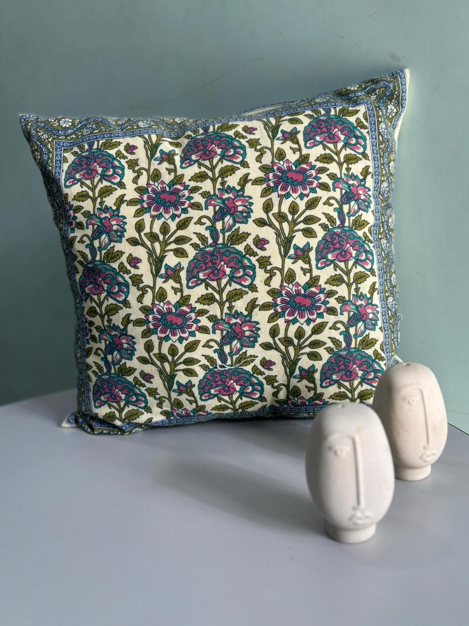 Echoing the vibrancy of Indian flora, the Crimson Blossom Medley cushion covers invite a warm embrace into your living space. Each piece showcases intricate floral designs, skillfully hand block printed to celebrate the rich tapestry of traditional artistry.