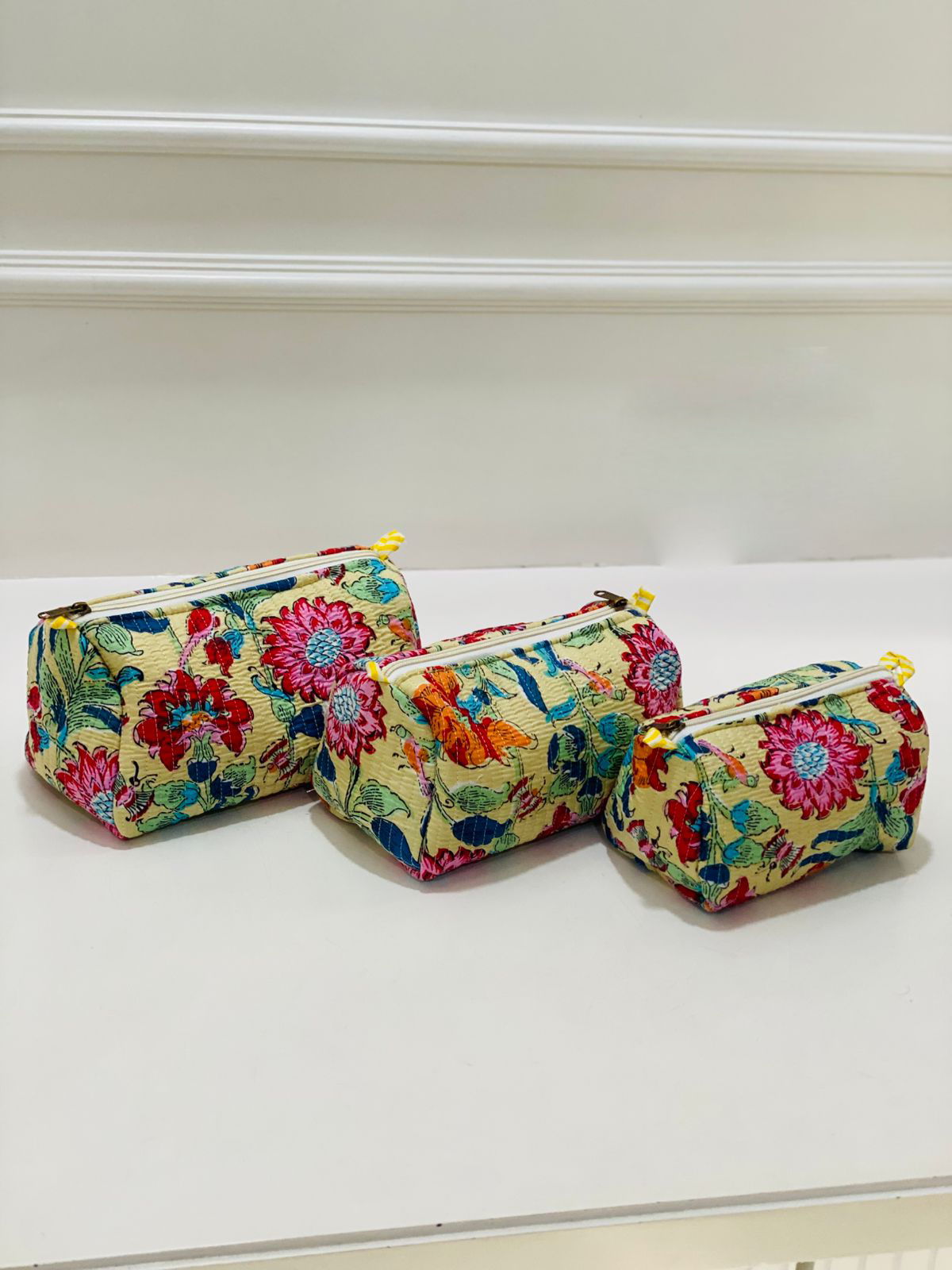 With bright yellow zipper pulls adding a playful hint of color, these pouches not only serve as practical organizers but also as beautiful decor for your space. Whether you choose to use them at home or take them on your travels, they make a charming companion.