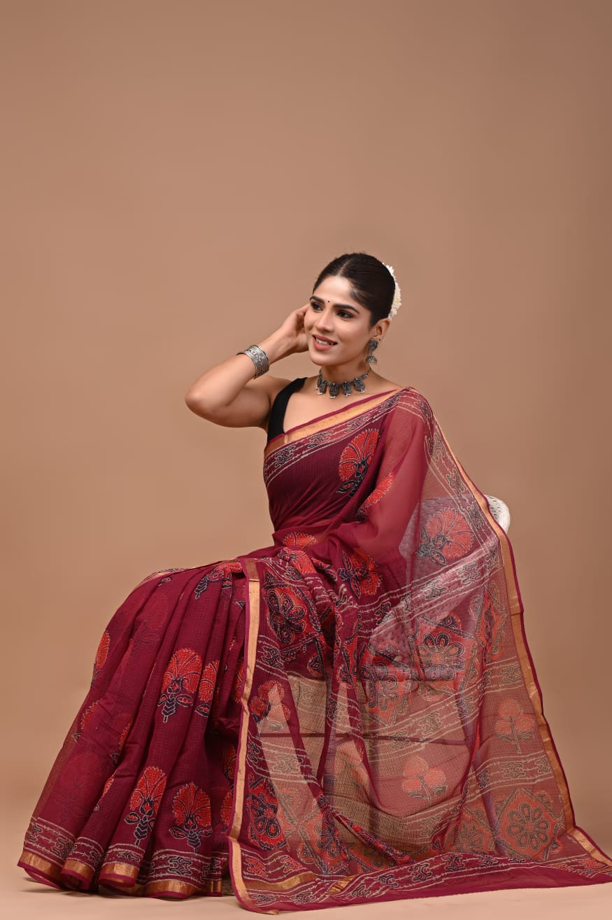Rooted in the rich heritage of Indian textile artistry, our Crimson Blossom Traditional Kota Doria Saree is a testament to the intricate craftsmanship that defines Blockart. Adorned with a lively array of multicolored floral designs, this piece brings a touch of nature's beauty to your wardrobe. The hand block printing technique showcases every detail, celebrating the skill and artistry of our craftsmen.