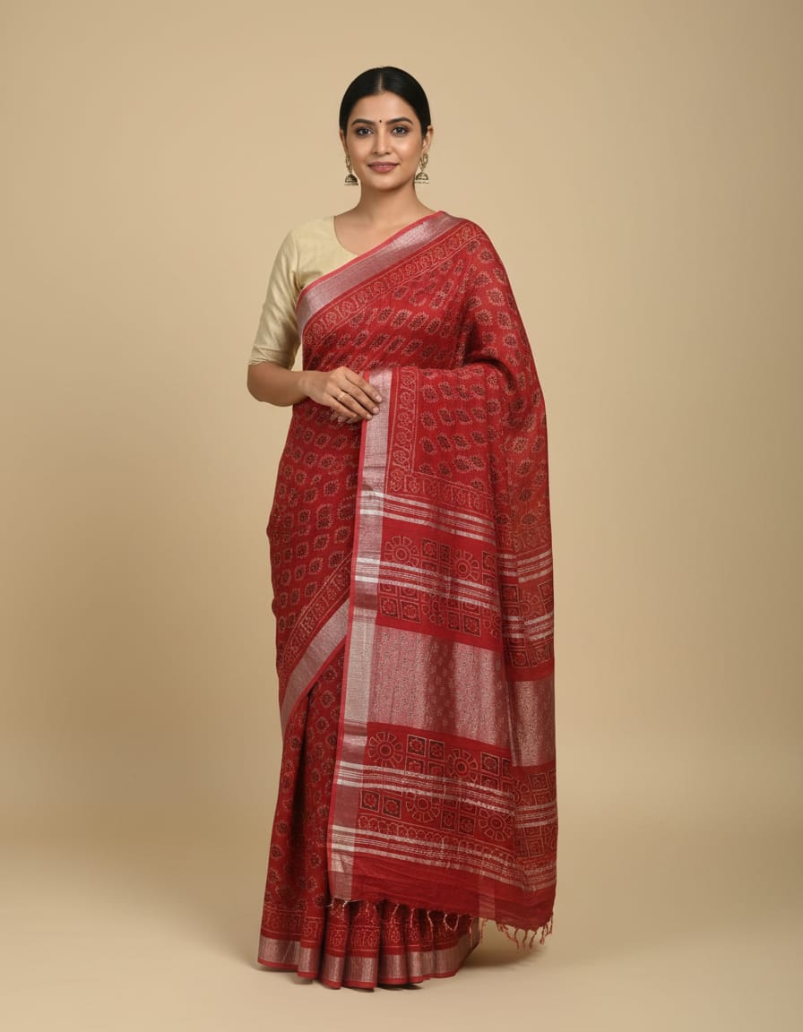 Let the vibrant beauty of our Crimson Blossoms Bagru Hand Block Print Saree adorn your moments. This exquisite piece reflects the rich heritage of Indian craftsmanship, showcasing an intricate interplay of floral and geometric designs that dance across the fabric. Artisan-crafted from pure Maheshwari silk, it offers a lustrous sheen that catches the light beautifully, while also being delightfully lightweight, making it a joy to wear.