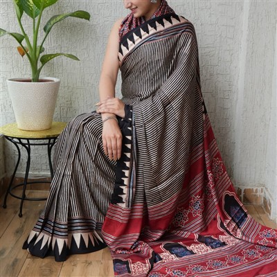 Embrace the allure of the Crimson Charm Geometric Modal Silk Saree with its striking black and beige striped body and a deep red pallu adorned with intricate floral and geometric motifs. This artisan-crafted piece blends traditional techniques with contemporary styling, creating a versatile garment perfect for various occasions. The lightweight and smooth modal silk fabric ensures comfort and lasting wear, while the rich color palette evokes a sense of sophistication and cultural richness. Dress in this saree to not only look stylish but also feel connected to the heritage of Indian craftsmanship.