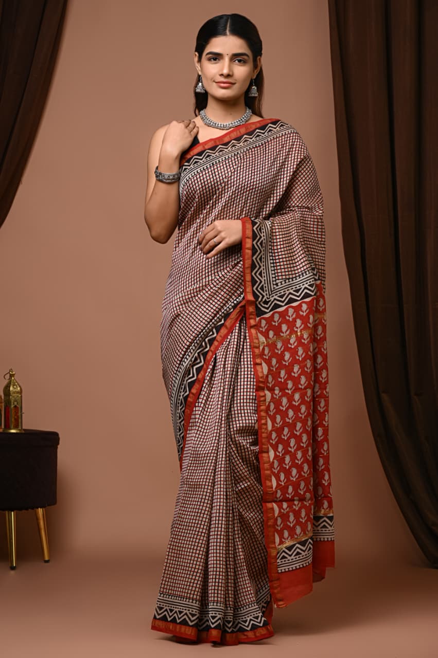 Crafted with meticulous attention to detail, this crimson checkered saree is a beautiful expression of Indian artistry. The charming interplay of rich red tones against a cream backdrop creates a warm canvas, perfect for any occasion. The bold black checkered pattern adds a contemporary twist, while the intricate floral motifs adorning the pallu bring forth the essence of traditional craftsmanship.