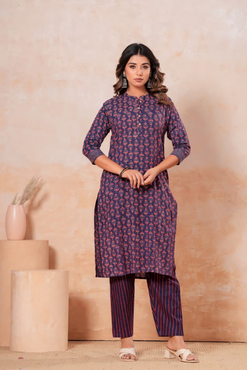 The kurti features a beautifully designed neck and a frock-style cut that drapes gracefully, while the accompanying pants add a touch of sophistication with their streamlined fit. Each piece showcases the skill of skilled artisans, ensuring that the vibrant patterns and colors remain enchanting through every wear.