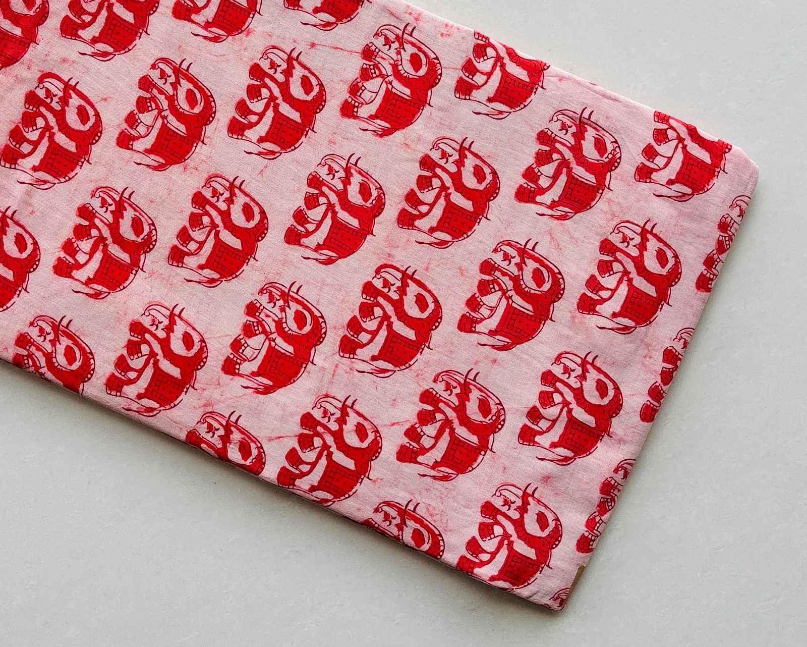 Let the joyful spirit of India come alive in your creations with our Crimson Elephant Dance Dabu Cotton Running Fabric. This exquisite textile showcases vibrant red elephants playfully dancing across a soft blush pink backdrop, infusing a sense of whimsy and cultural richness into your wardrobe.