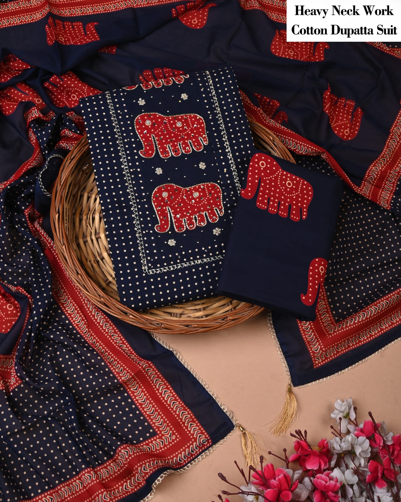 The top fabric, a pure cotton delight, boasts intricate Gota Patti work that adds a luxurious touch to the overall aesthetic. Its graceful neckline and meticulously crafted borders reflect a commitment to artistry. Complementing the top, the bottom fabric is soft and breathable, ensuring comfort during wear.