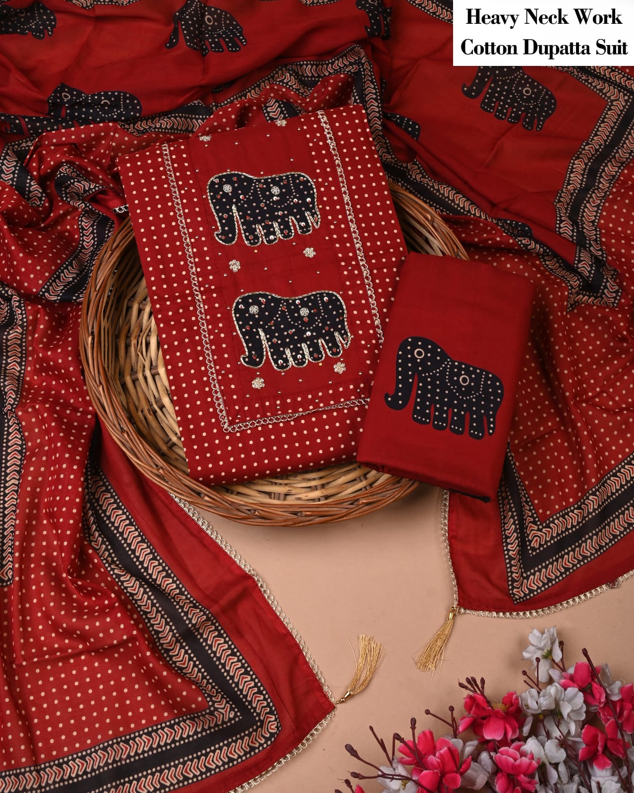 Immerse yourself in the vibrant hues and exquisite craftsmanship of our Crimson Elephant Reverie Cotton Suit Set. This ensemble encapsulates the spirit of traditional artistry, where the bold elephant motifs dance across a striking crimson canvas, exuding a sense of festivity and charm.