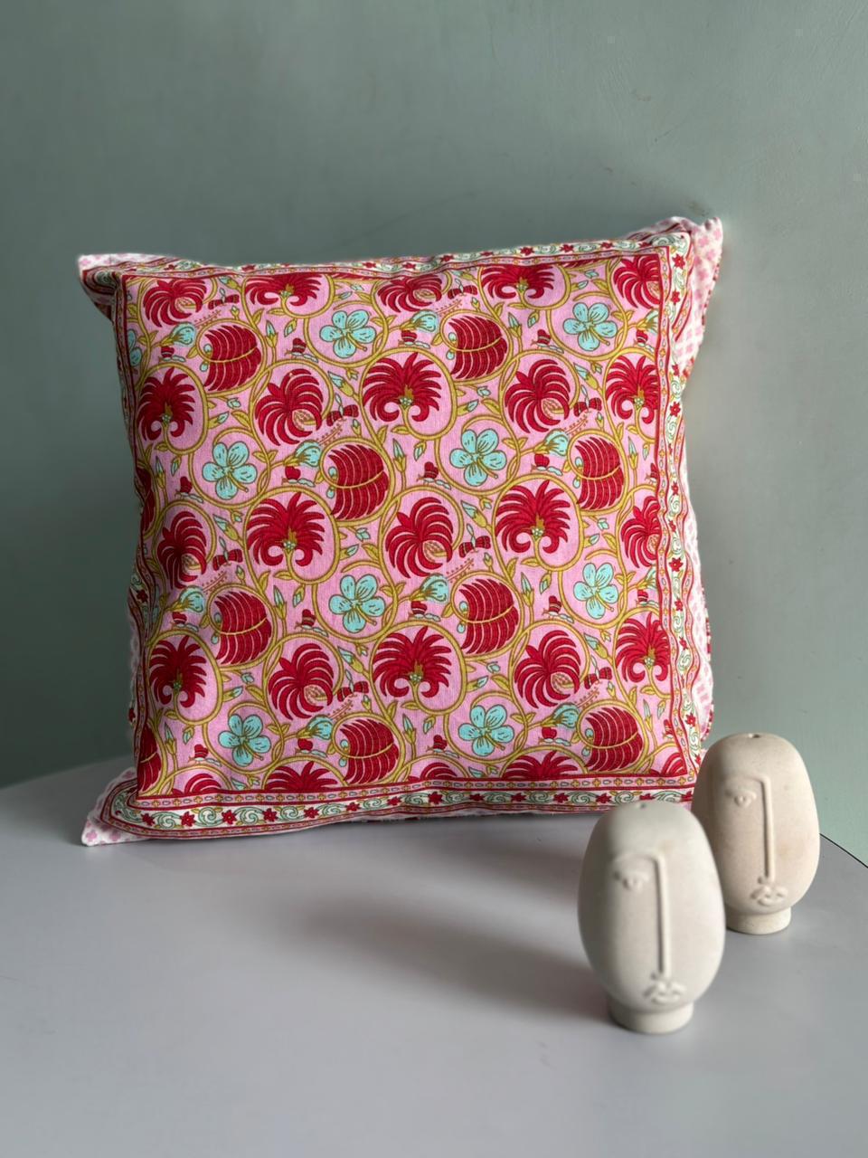 Crafted with an essence of traditional Indian artistry, the Crimson Flora Swirl cushion covers bring a touch of vibrant elegance to your home. Each piece showcases an intricate floral pattern, reflecting the skill of artisans who pour their passion into every detail. The rich crimson backdrop is adorned with lively turquoise leaves and delicate golden accents, creating a harmonious visual rhythm that’s sure to brighten any room.