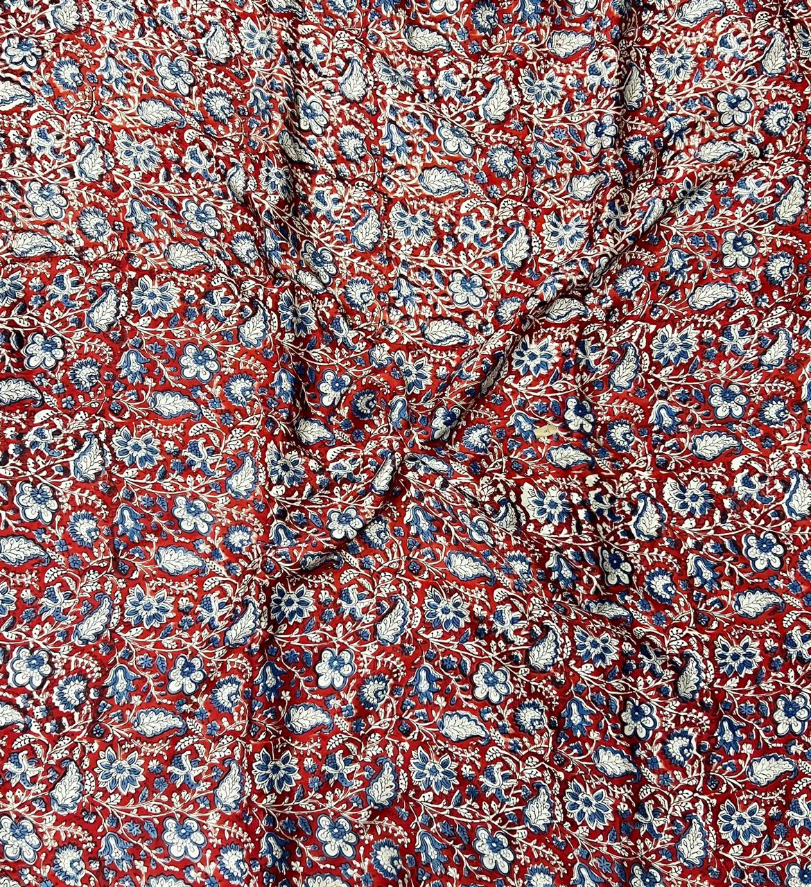 Crafted from the heart of India, this stunning fabric showcases a cascade of floral motifs in rich crimson hues, harmoniously intertwined with soothing cobalt blue and soft cream accents. Each intricate detail is a testament to the skilled artisans who breathe life into traditional block printing techniques, resulting in a tactile experience that is both inviting and unique.