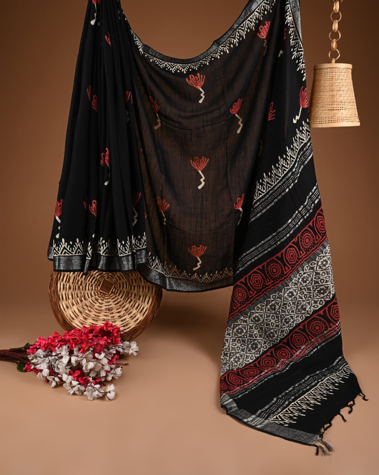 Are you ready to embrace the charm of traditional artistry? This crimson linen saree is a delightful fusion of vibrant floral motifs and intricate geometric borders, bringing a touch of sophistication to your wardrobe. The rich, deep red tones are beautifully complemented by soft beige accents, creating a striking visual appeal that captures the eye.