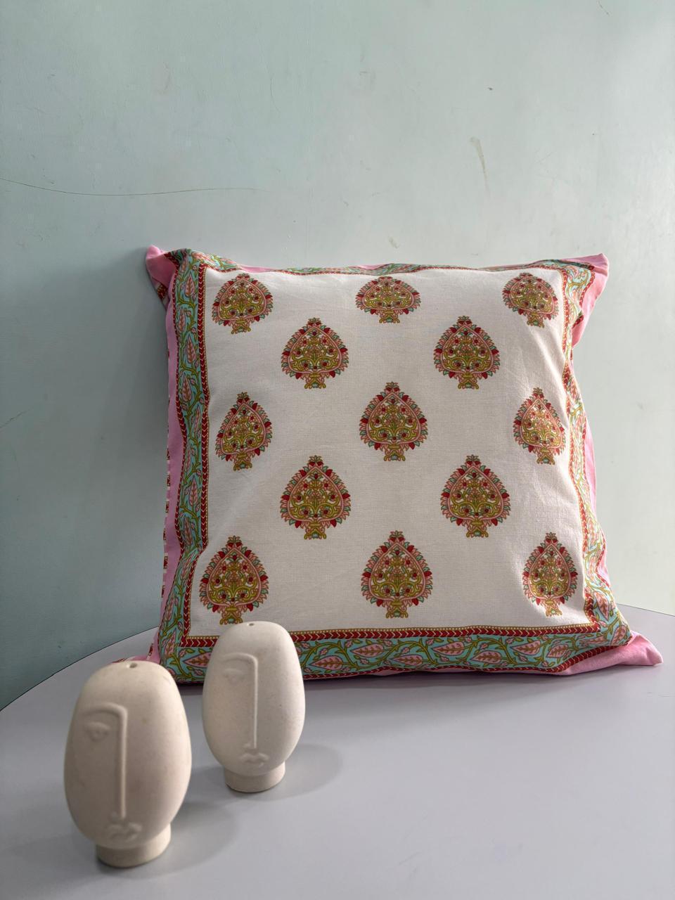 Adorn your living space with the vibrant hues of our Crimson Floral Delight cushion covers. The ivory backdrop, adorned with intricate floral motifs in rich crimson, golden yellow, and a refreshing emerald green, brings a sense of joy and warmth. Each detail has been artisan-crafted to ensure that every stitch echoes the rich traditions of Indian block printing, making these covers not just decorative, but a celebration of craftsmanship.