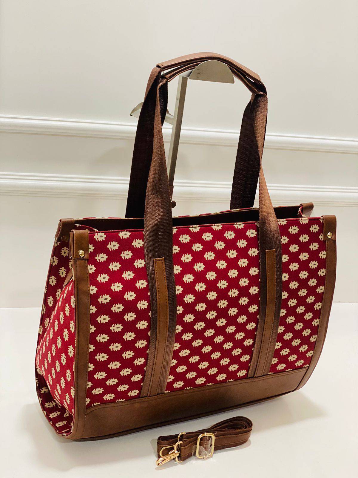 This bag features a vibrant crimson backdrop adorned with intricate floral motifs in soft cream, creating a delightful contrast that captures the eye. The structured design ensures it holds its shape beautifully, while the textured fabric adds a tactile quality that feels delightful to the touch.