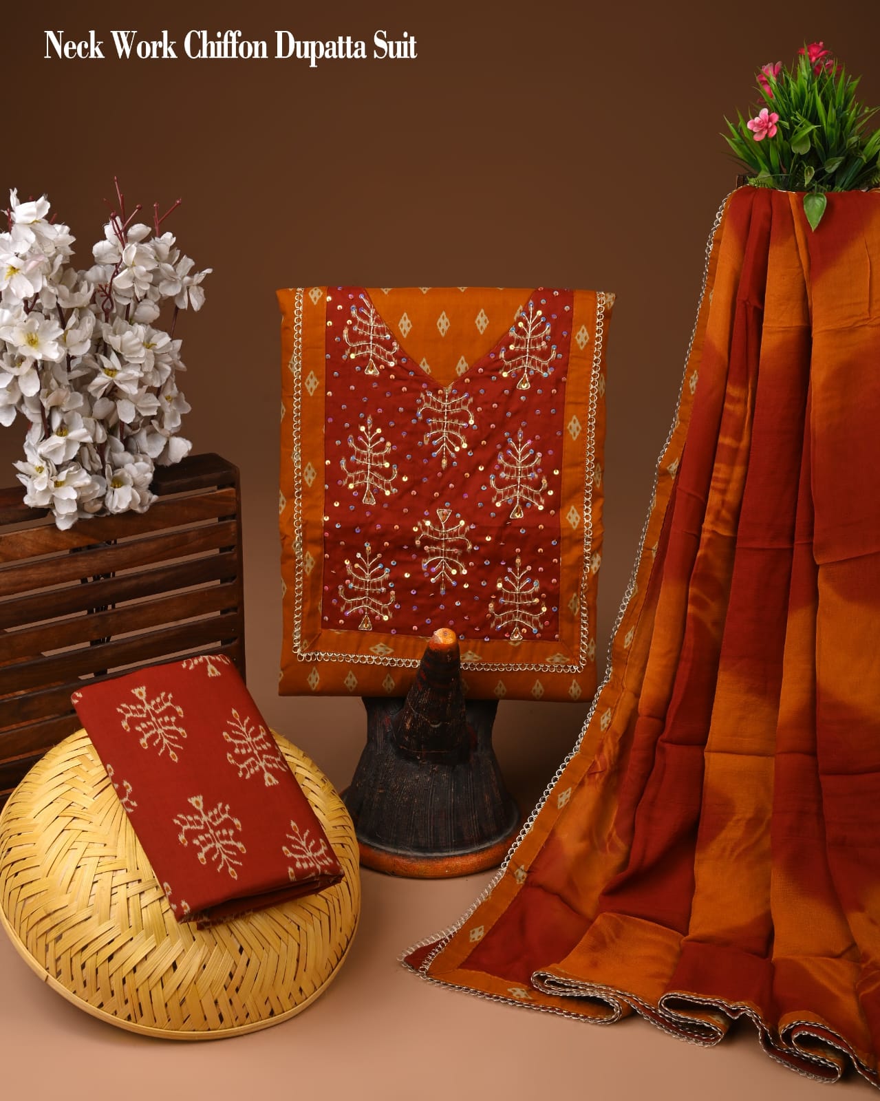 Each piece tells a story, woven with the threads of tradition and artistry. This stunning crimson suit set features intricate floral motifs that whisper tales of Rajasthan's vibrant culture. The exquisite gota patti detailing and the heavy stitched neckline create a striking visual appeal, making it a beautiful addition to your wardrobe.