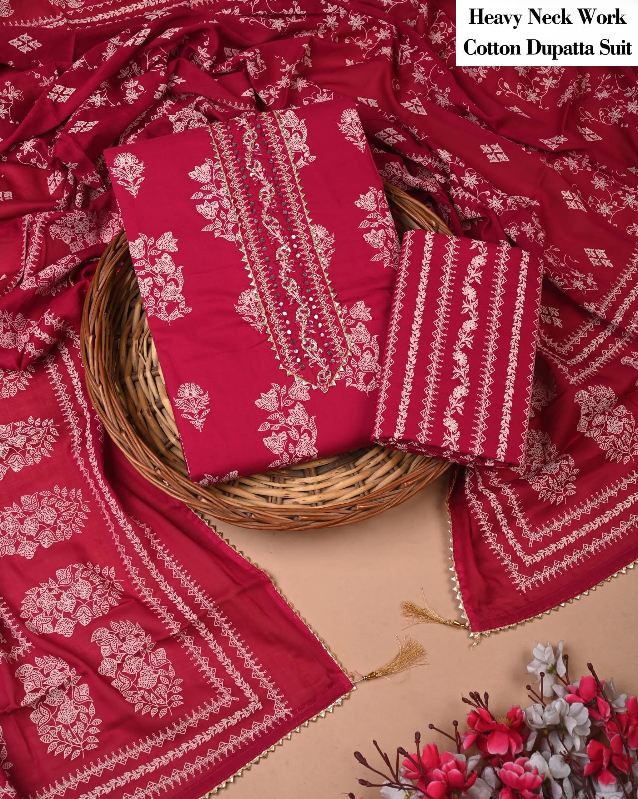 Crafted with meticulous attention to detail, it features an elegantly stitched neckline paired with intricate borders that echo the heritage of craftsmanship. The soft bottom fabric ensures comfort, allowing an easy transition from day to evening wear. Accompanied by a dupatta finished with a rich zari border and stylish tassels, this ensemble speaks to the senses and celebrates the legacy of Indian textiles.