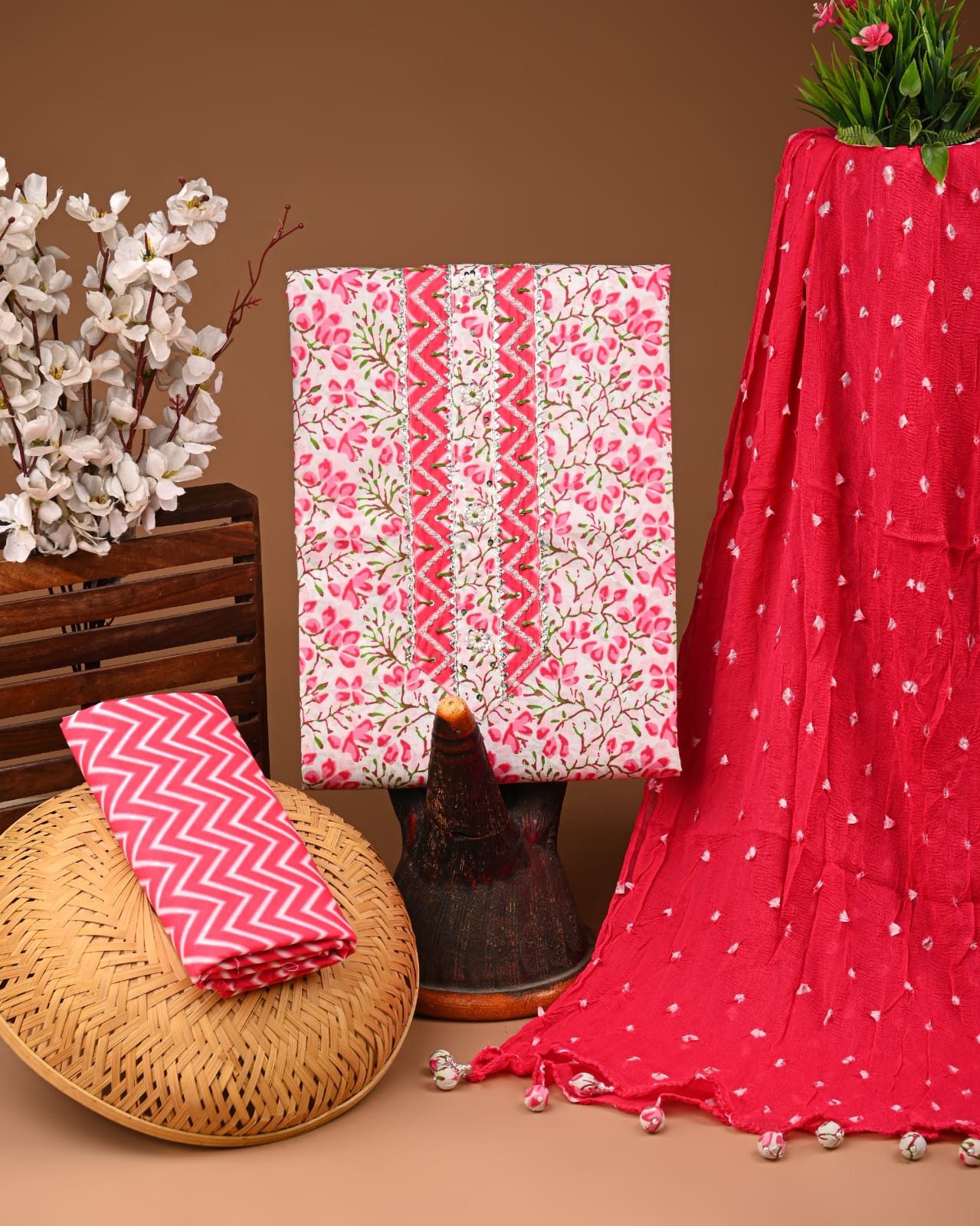 Drawing inspiration from the vibrant landscapes of Rajasthan, this cotton suit set captures the essence of traditional artistry with its delightful crimson floral motifs dancing against a soft pink backdrop. The intricate gota patti detailing along the neckline adds a touch of sophistication, echoing the age-old craftsmanship that defines Jaipuri textiles.