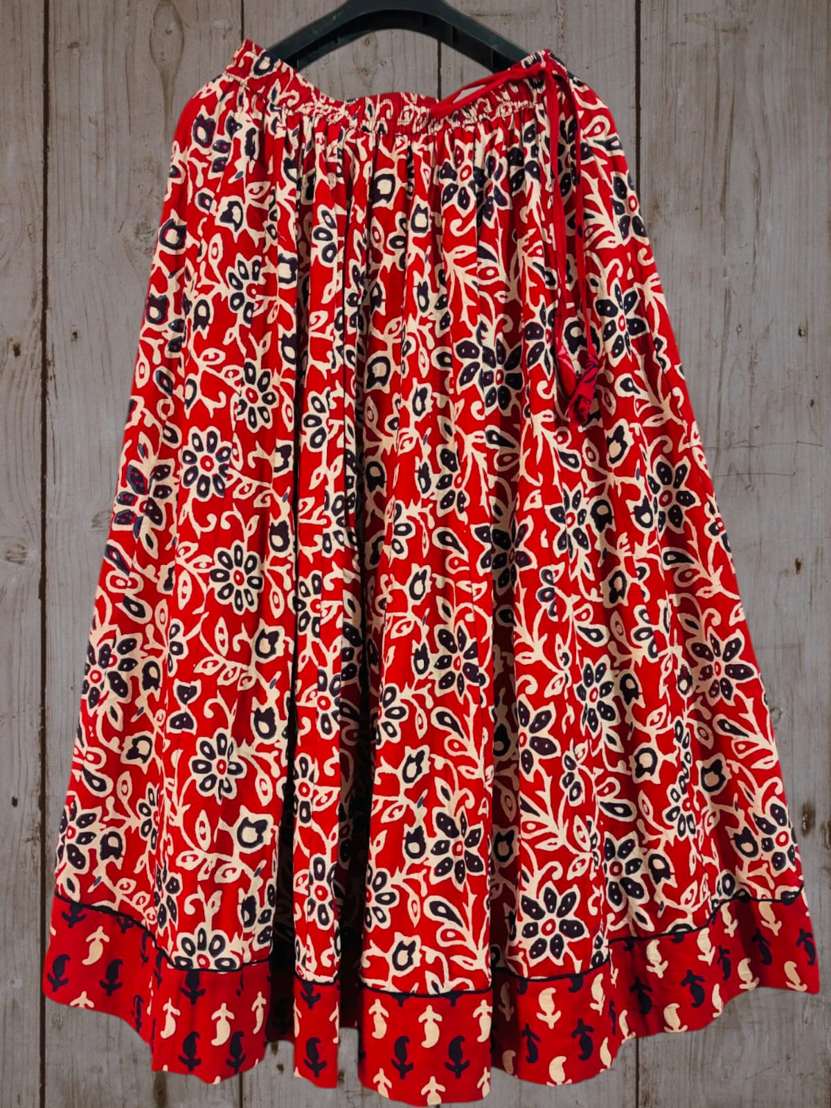 Elevate your wardrobe with our Crimson Floral Hand Block Cotton Skirt, featuring exquisite hand block printing on pure cotton fabric. The gathered waistband with a drawstring tie ensures a comfortable fit. This long, full skirt boasts a 5.5 meters flare made with 28 panels for a graceful flow. Embrace the artisanal craftsmanship and traditional Indian design with this premium ethnic wear.