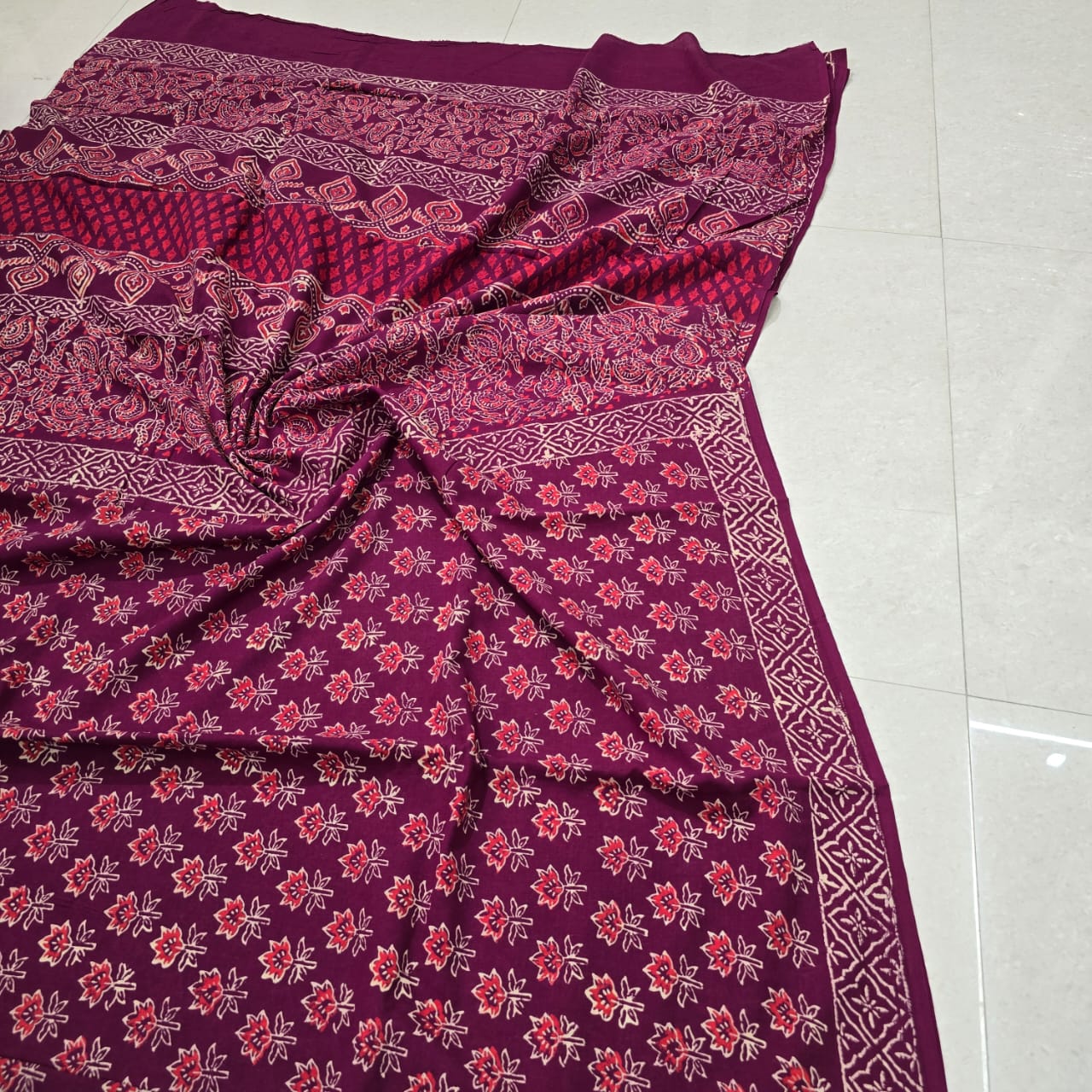 Crimson Floral Hand Block Printed Mulmul Cotton Shawl