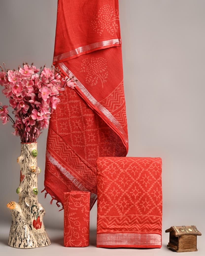 Crimson Floral Linen Cotton Hand Block Printed Suit Set