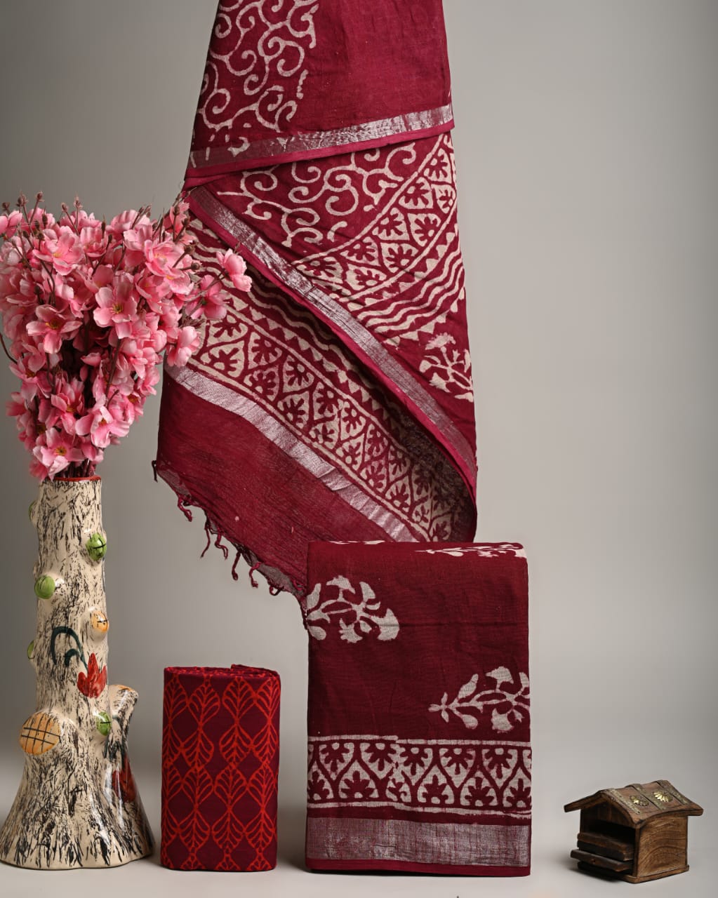 Handblock Printed Linen Suits With Silver Border: