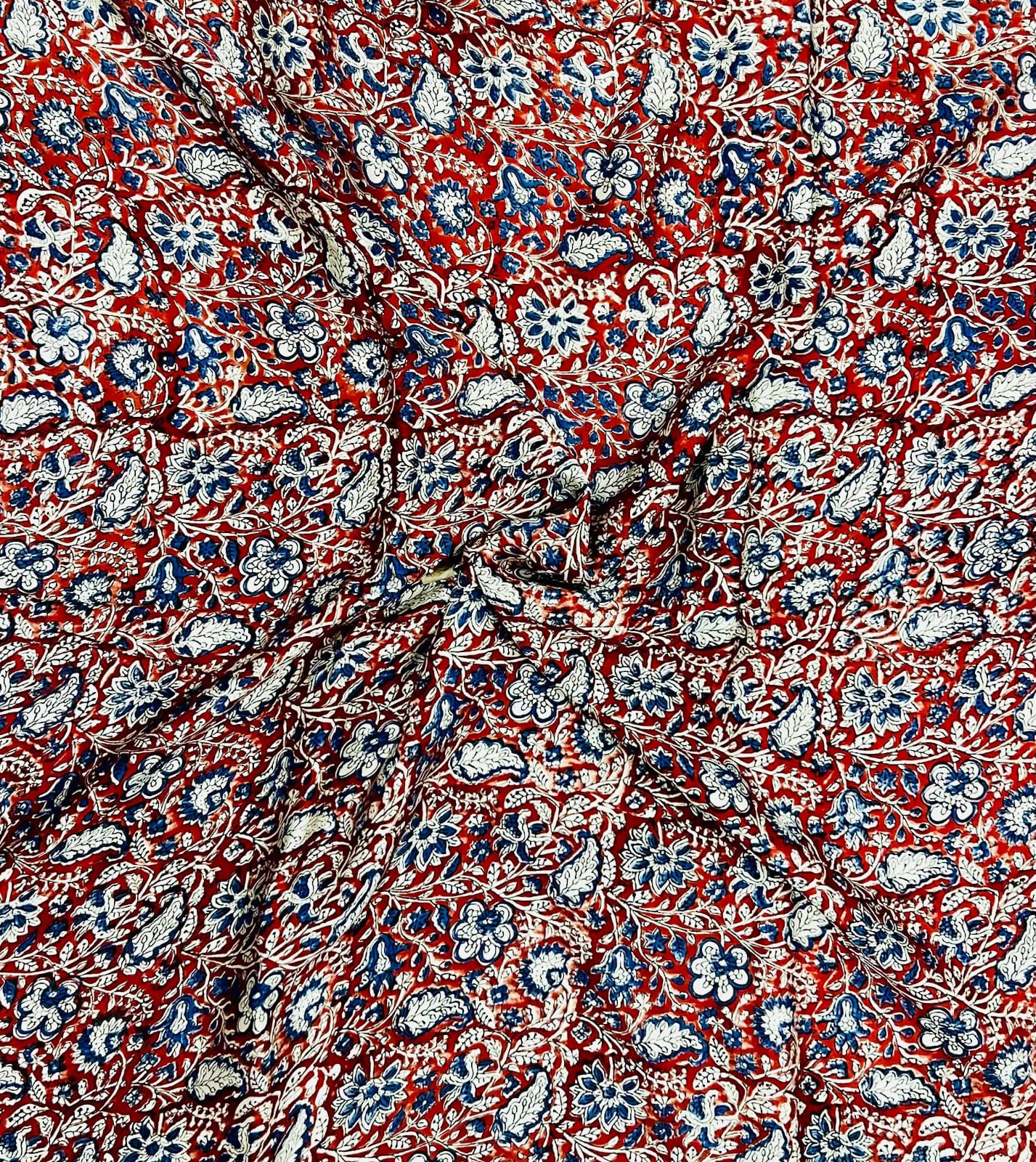 In a tapestry of rich crimson, this exquisite modal silk fabric features a mesmerizing floral pattern, finely detailed with hints of navy and light blue. Each motif tells a story, showcasing the intricate artistry of hand block printing that has been cherished for generations. The smooth texture and soft drape make it a delightful choice for any creation, whether it’s a flowing dress or a stylish scarf.