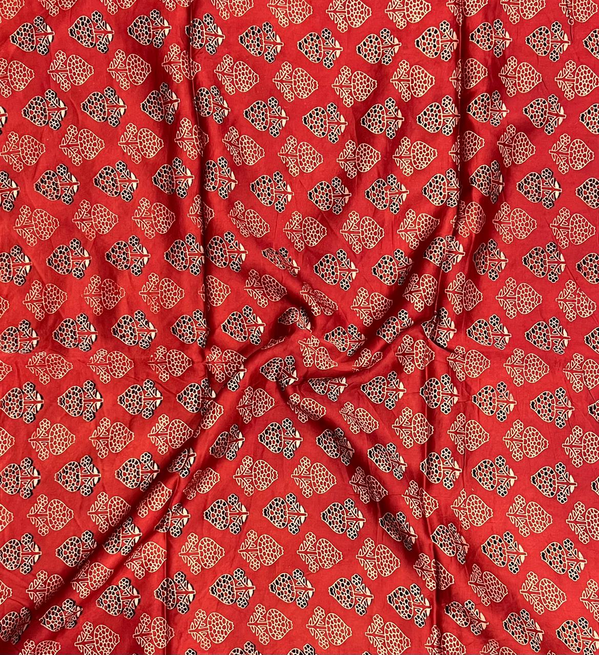 Immerse yourself in the traditional beauty of India with our Crimson Floral Mosaic Modal Silk Fabric. This exquisite textile showcases a stunning arrangement of floral motifs, beautifully contrasted against a rich crimson backdrop. Each design element is meticulously hand block printed, a testament to the time-honored techniques employed by skilled artisans. The intricate detailing and bold patterns reflect the vibrant spirit of Indian craftsmanship.