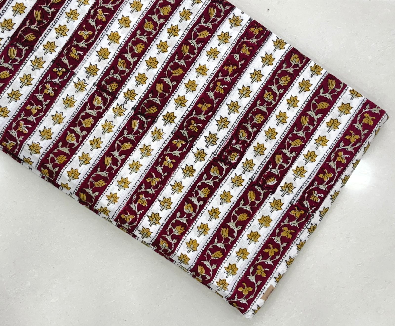 Rooted in the rich heritage of Indian craftsmanship, the Crimson Floral Symphony Cotton Running Fabric beautifully showcases an interplay of wide crimson stripes and delicate floral motifs. Each element is skillfully block printed, reflecting the passion and artistry of traditional techniques.