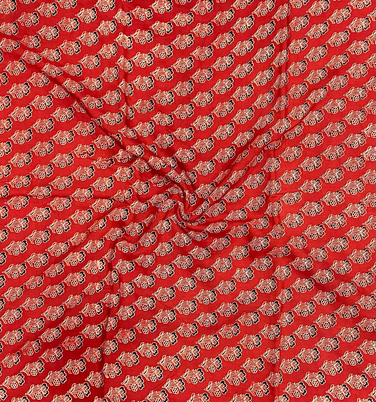 Step into a vibrant world where traditional artistry meets contemporary elegance with our Crimson Floral Symphony Modal Silk Fabric. This exquisite textile showcases intricate floral motifs, each lovingly crafted through the time-honored technique of hand block printing. The lively crimson base is beautifully contrasted by bold black and soft ivory accents, creating a stunning visual tapestry that breathes life into any ensemble.