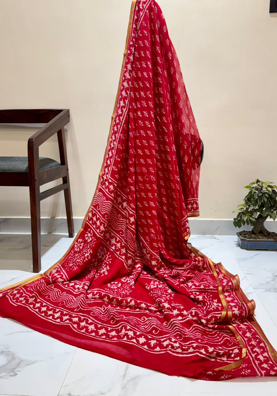 Elevate your ethnic wardrobe with this exquisite Crimson Floral Symphony Saree. Crafted from Pure Double Diamond Chiffon with bemberg silk, this saree showcases intricate hand block floral patterns, a golden border, and a luxurious pallu design. The lightweight and flowy fabric ensure comfort and elegance, making it a perfect choice for special occasions.