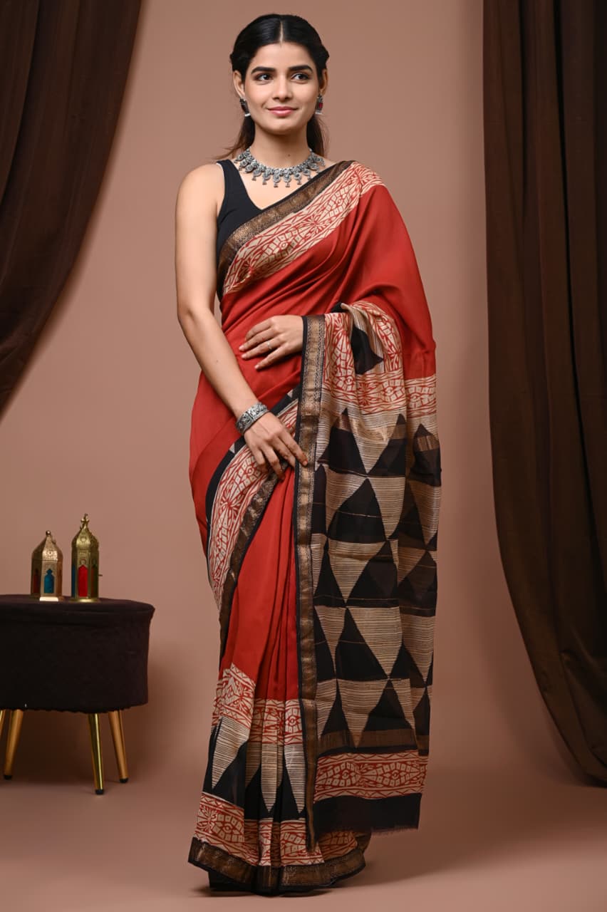 Crafted with a deep crimson base and intricate black geometric motifs, this saree embodies the perfect marriage of traditional artistry and contemporary aesthetics. Each piece tells a story of heritage, meticulously block printed to create a striking visual narrative that captures the essence of Indian craftsmanship.