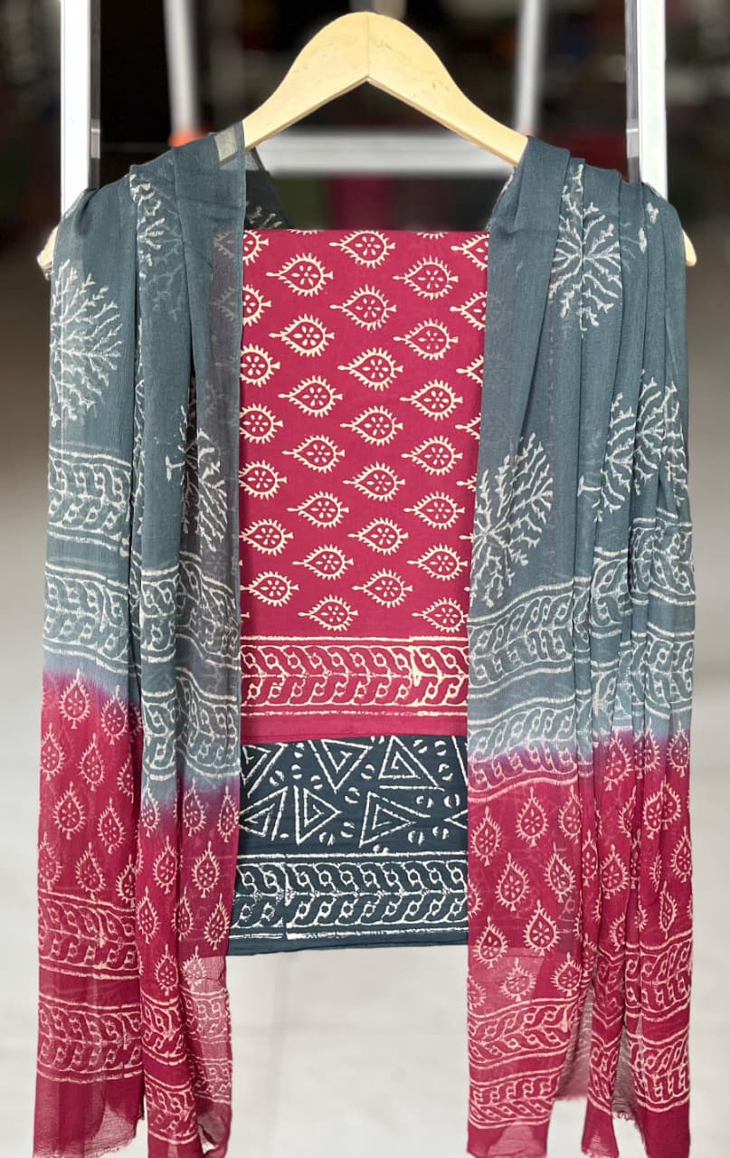 Crafted from 100% pure cotton, the Crimson Geometric Essence Cotton Suit Set is a celebration of traditional artistry and contemporary flair. The rich crimson fabric serves as a stunning canvas for intricate ivory patterns, showcasing meticulously crafted geometric motifs that whisper tales of time-honored techniques.