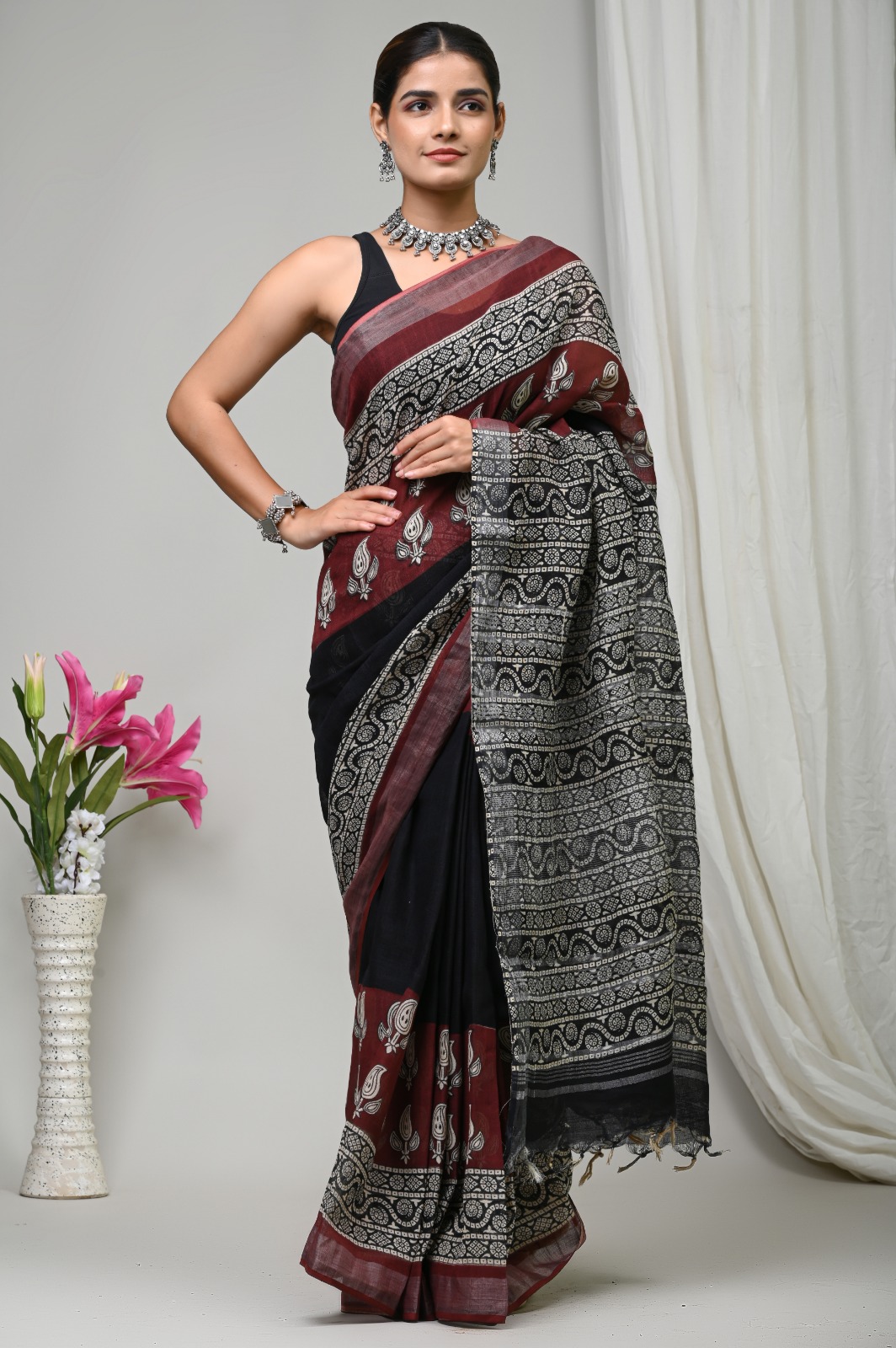 Rooted in the rich heritage of Indian craftsmanship, the Crimson Geometry Linen Saree is a stunning embodiment of artistry. The elegant interplay of deep crimson against a sophisticated black backdrop features intricate geometric patterns, each print reflecting the dedication and skill of our artisans.