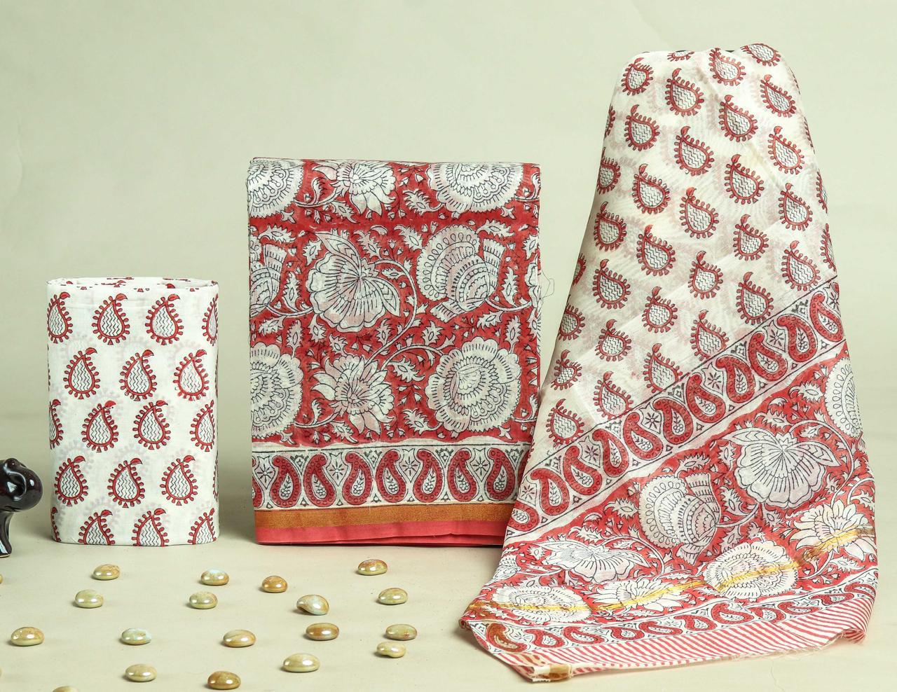 Elevate your wardrobe with this exquisite hand block printed Chanderi silk dress set from Blockart. Crafted with precision, the top and duptta feature a stunning crimson paisley design, while the comfortable cotton bottom complements the set. The artisanal touch of traditional block printing adds a unique charm to this ensemble. Embrace the elegance of Indian craftsmanship with this premium dress material.