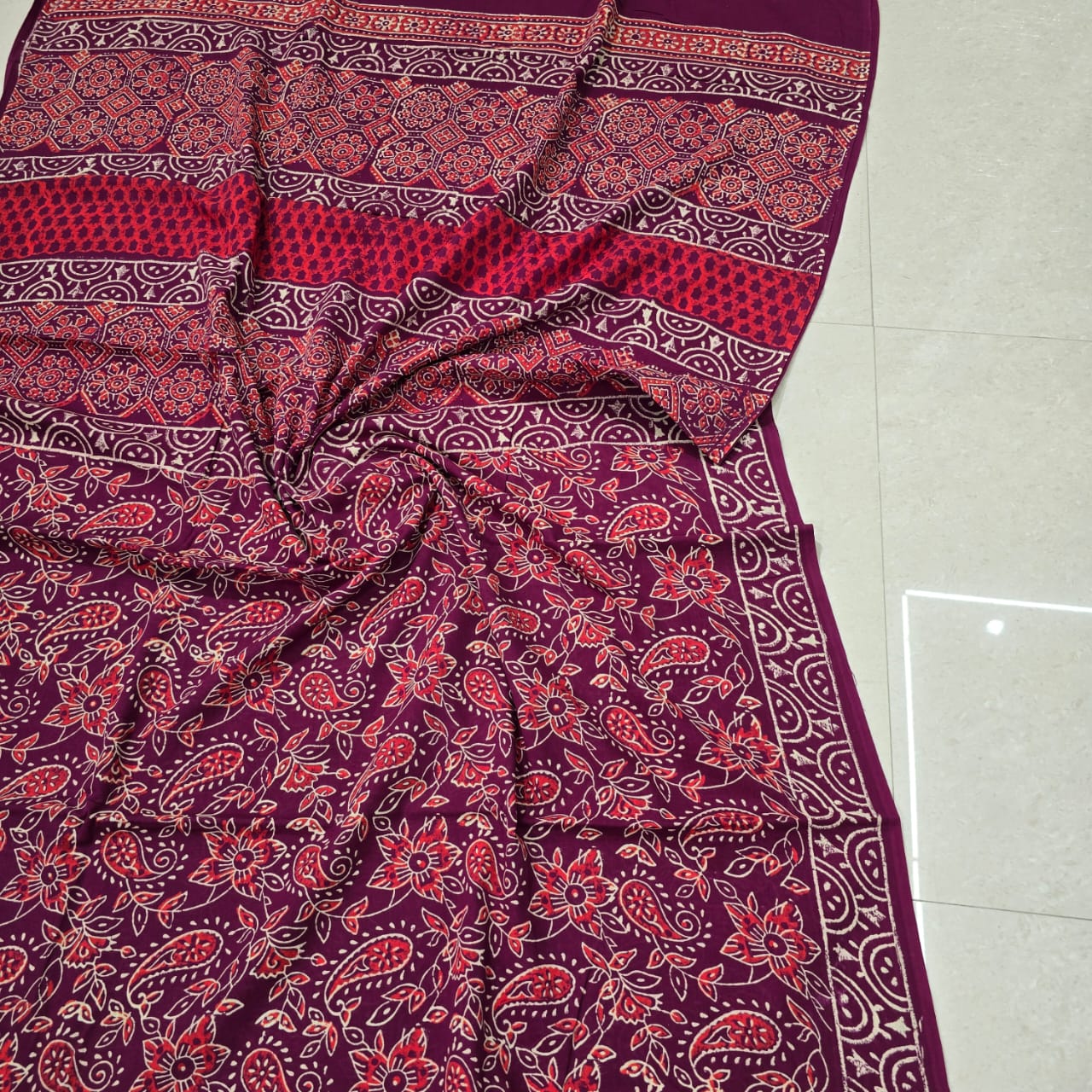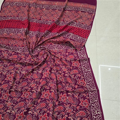 Elevate your ethnic wardrobe with this exquisite hand block printed mulmul saree set. Crafted with precision and care, this saree features intricate crimson paisley patterns that exude traditional charm. Made from premium cotton mulmul fabric, it offers exceptional comfort and a graceful drape. The set includes a 5.5-meter saree with super dyeing finish and a matching printed blouse piece (80 cm). Embrace the artistry of Indian hand block printing with this timeless ensemble.