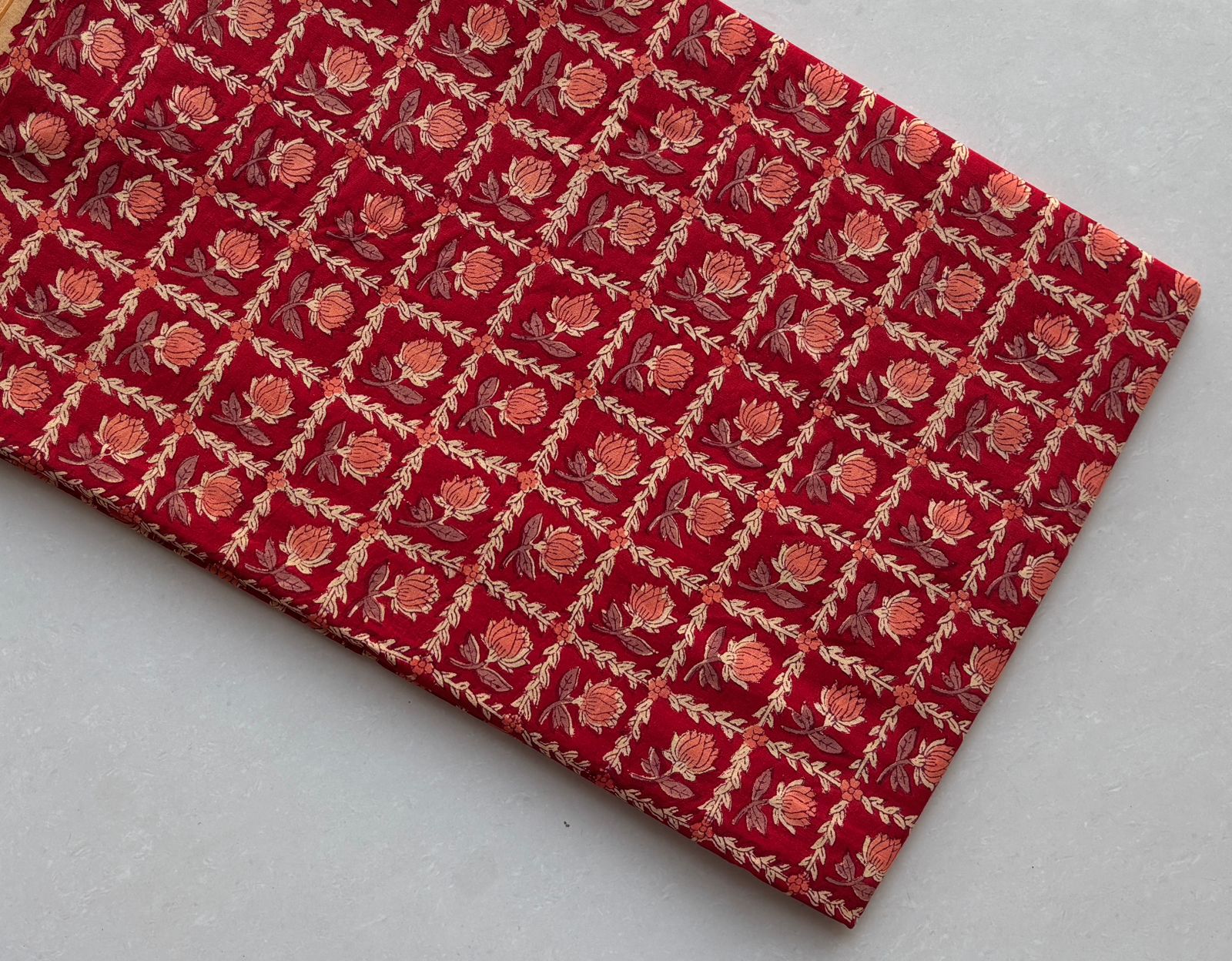 In the heart of our collection lies the Crimson Rose Blossom Cotton Running Fabric, a celebration of traditional artistry and vibrant storytelling. This fabric features an enchanting floral design, where delicate roses bloom against a warm crimson backdrop, enhanced by soft peach and light coral tones. The muted sage green leaves add an earthy touch, creating a harmonious blend that is both inviting and inspiring.