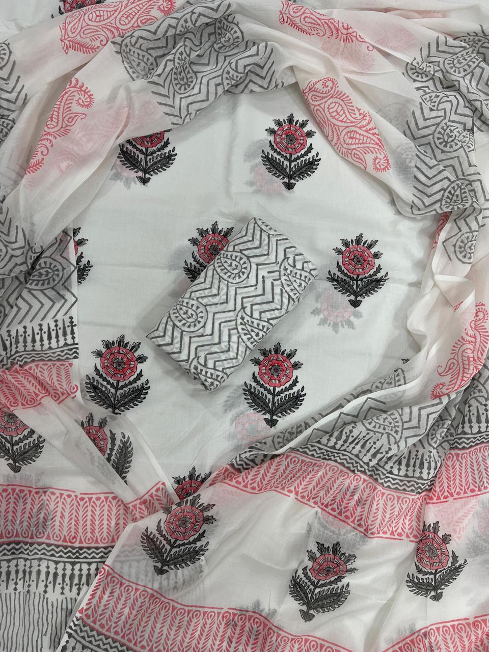 Are you searching for a piece that effortlessly combines artistry with everyday wear? This charming cotton suit set showcases an inviting palette of crimson roses, embraced by intricate geometric patterns. The fabric, lightweight yet substantial, caresses the skin, allowing for comfortable movement whether you're at a casual gathering or a festive celebration.