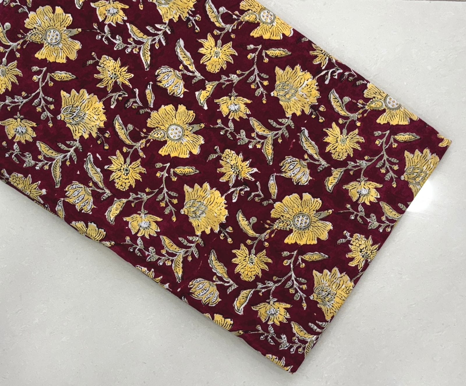 Rich in tradition and bursting with color, our Crimson Sunflower Floral Cotton Running Fabric embodies the essence of artisanal craftsmanship. This stunning textile features a deep crimson backdrop that harmonizes beautifully with bright sunflower yellow floral motifs, accented by soft gray leaves that add depth and character to the design.