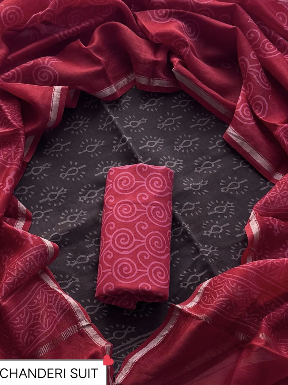Immerse yourself in the intricate beauty of the Crimson Swirl Chanderi Silk Ensemble. This ensemble features a deep red hue with delicate swirl patterns in a lighter shade of pink. The black base fabric showcases subtle motif patterns, enhancing the overall elegance. The silver border adds a touch of sophistication, making this ensemble perfect for special occasions. Crafted with artisanal techniques, this ensemble offers a lightweight, sheer texture typical of Chanderi silk, ensuring comfort and style. Elevate your wardrobe with this masterpiece that seamlessly blends tradition with contemporary charm.