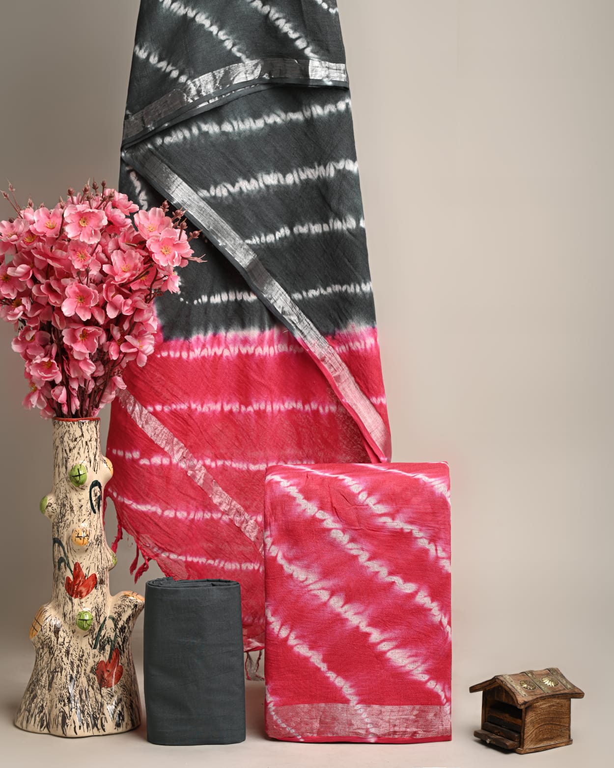 Elevate your ethnic wardrobe with this exquisite handcrafted suit set from Blockart. The top features intricate Bagru hand block printing on soft linen cotton fabric, embellished with a striking crimson tie-dye pattern and elegant silver border. The matching dupatta complements the ensemble, while the cotton bottom piece ensures comfort and style. Experience the artistry of traditional Indian craftsmanship and embrace the allure of artisanal fashion.