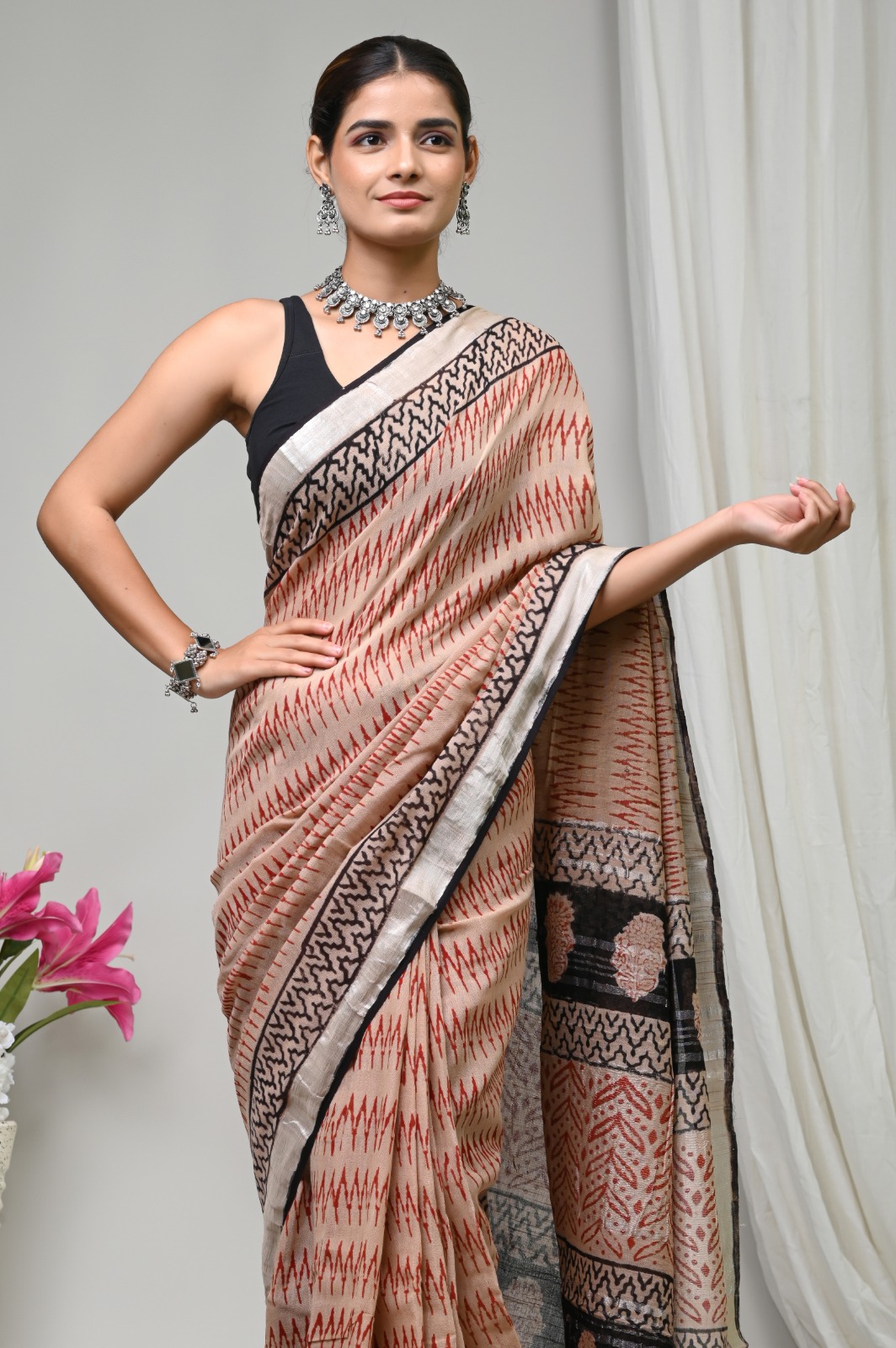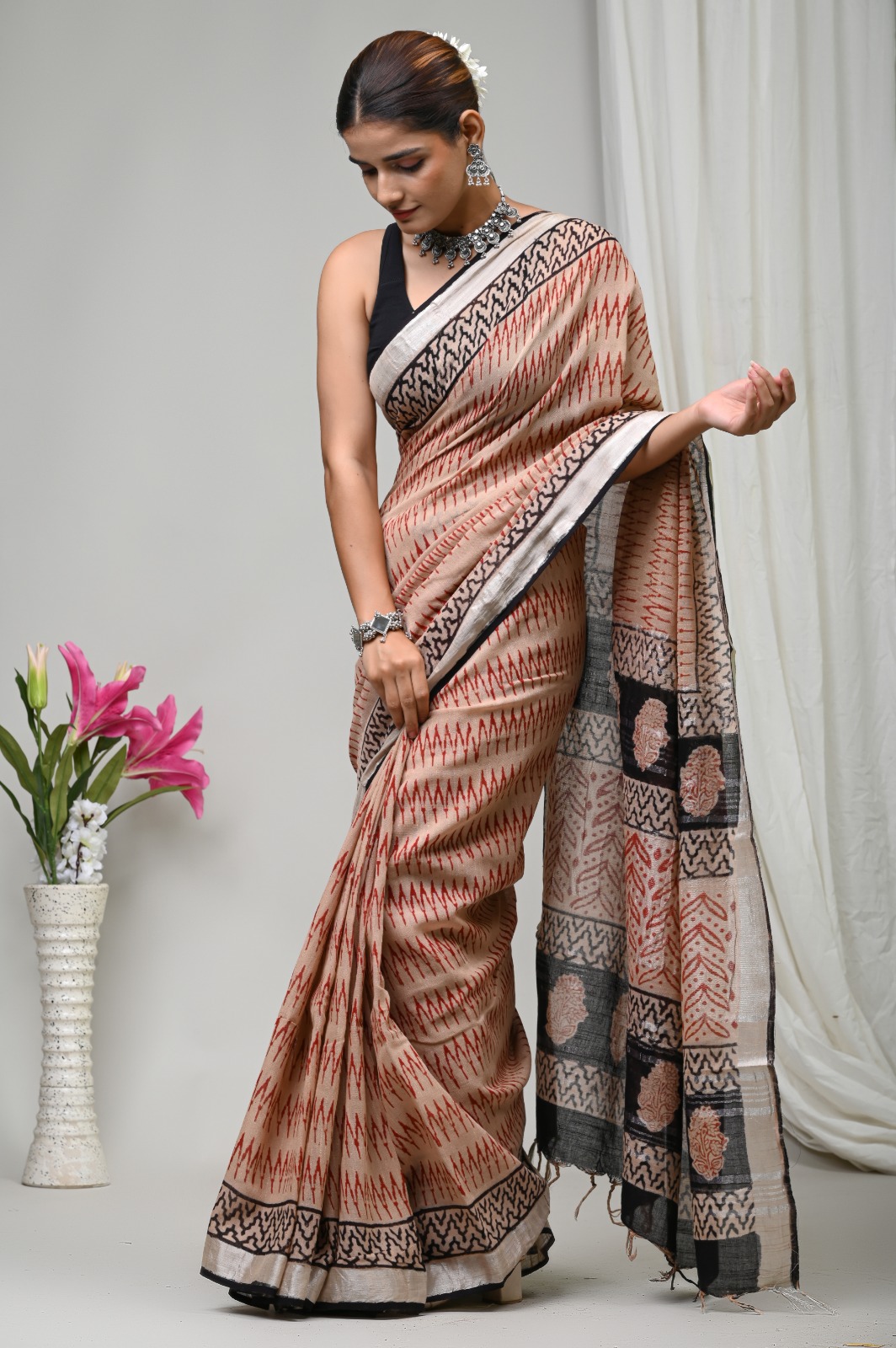 Crafted through time-honored techniques, our Crimson Zigzag Hand Block Printed Linen Saree beautifully intertwines traditional artistry with contemporary aesthetics. The warm beige base serves as a canvas for bold crimson zigzag patterns, creating a striking visual narrative. Accentuated by a rich black border and delicate dusty rose floral motifs, each fold tells a story of skilled craftsmanship and attention to detail.